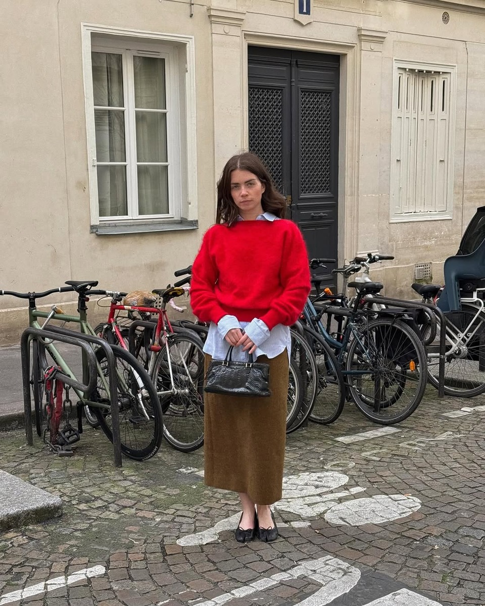 몸도 마음도 무겁게만 느껴지는 월요일 아침, 스타일링 하나로 활력을 불러올 수 있어요. 브라운 펜슬 스커트와 블루 셔츠의 단정한 조합 위에, 비비드한 레드 니트를 툭 걸쳐 보세요. 바쁜 출근길에 에너지를 불어넣어 줄 뿐 아니라 얼굴이 화사해 보이는 효과까지 챙길 수 있을 거예요.