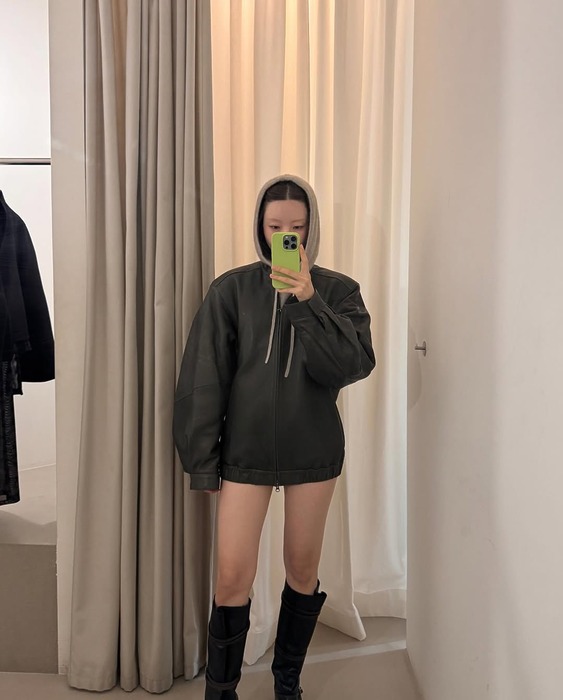 이번 시즌 레더 재킷은 두께와 볼륨이 핵심! 묵직한 소재 덕에 아우터 자체가 조형감을 만들어내니, 하의는 짧은 기장을 선택해 가볍게 가져가는 것이 좋아요. 여기에 롱부츠를 더하면 다리가 길어 보이는 효과까지 챙길 수 있을 거예요.
