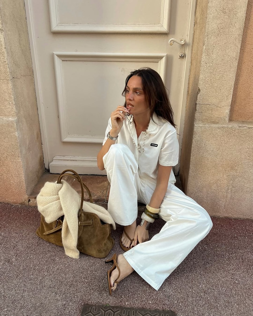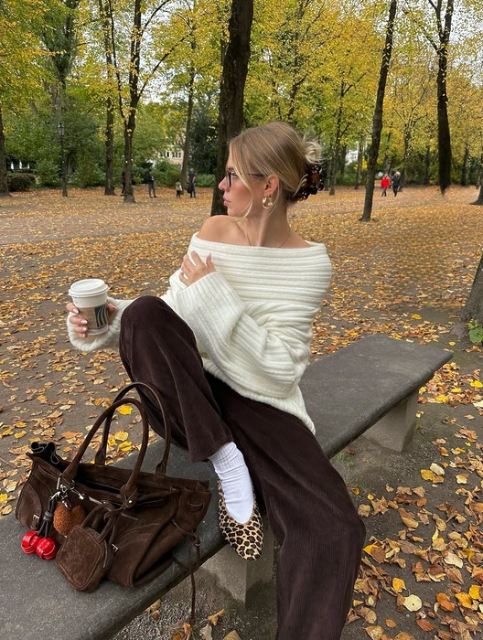 가장 기본적이지만 가장 세련된 조합, 화이트와 브라운입니다. 올 화이트 룩에 카멜 컬러의 스웨이드 백을 더하면 군더더기 없이 고급스러운 무드가 완성되죠. 자칫 차가워 보일 수 있는 화이트에 스웨이드 특유의 따뜻한 질감이 더해져 단순한 스타일에 계절감을 입혀줍니다.