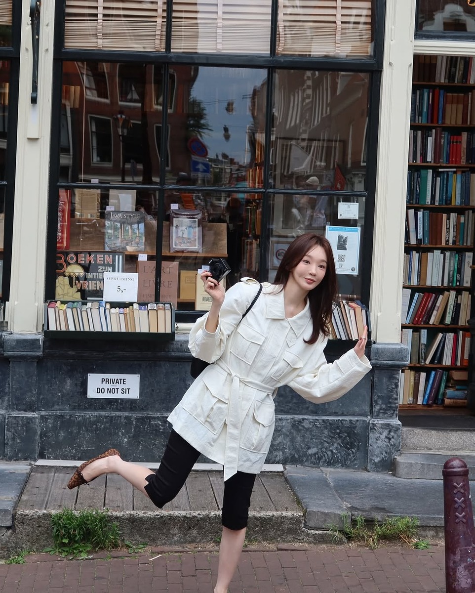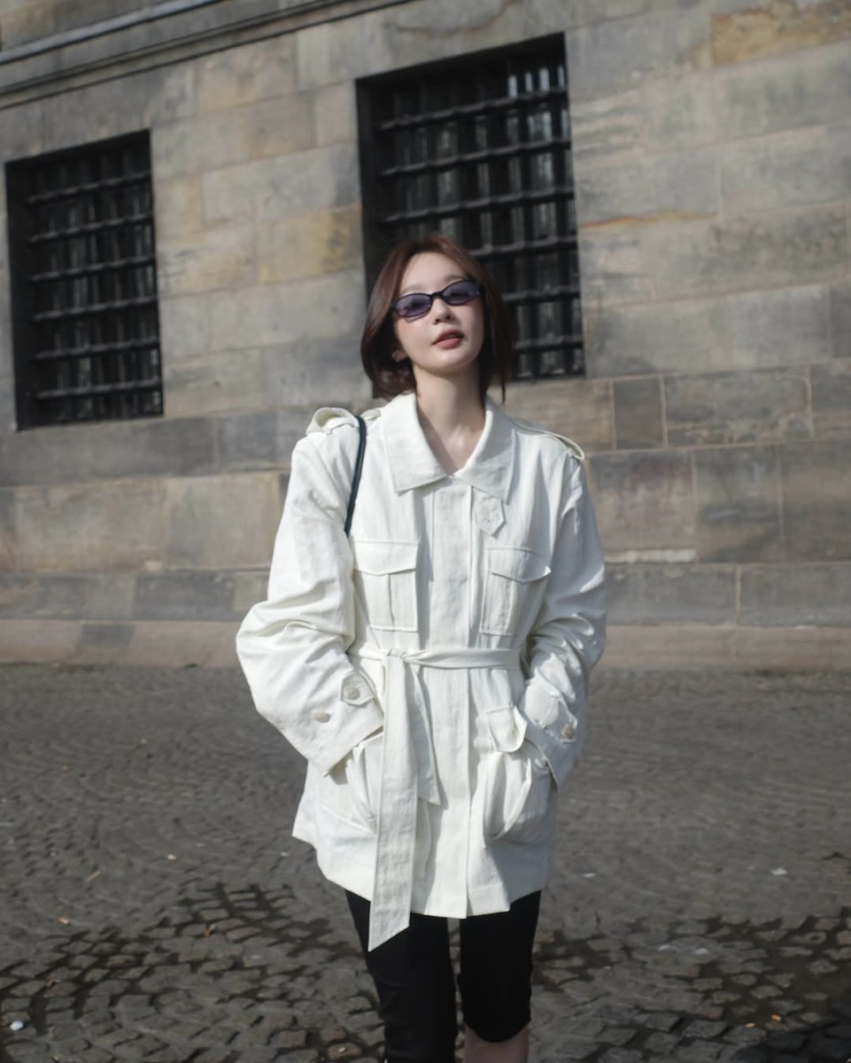 이 계절에 빠지면 섭섭한 트렌치코트. 이번 가을 옷잘알들은 트렌치코트 스타일링에 ‘대비감’을 강조해 주었어요. 강민경은 오버 핏에 여러 포켓이 달려 유틸리티 룩 느낌이 독특한 무드의 숏 트렌치코트를 사브리나 팬츠와 매치했습니다. 넉넉한 핏의 아우터와 슬림한 팬츠의 핏감의 대비, 그리고 화이트와 블랙의 강렬한 명도 대비가 스타일링을 더욱 인상 깊게 만들어 줍니다.