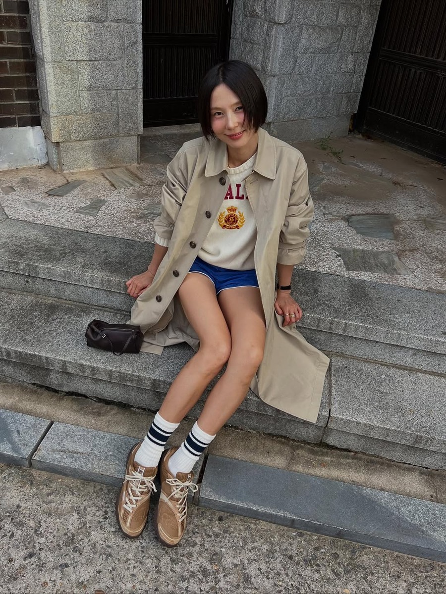 김나영은 정석적인 카멜색 트렌치코트를 니트, 그리고 스포티한 무드의 쇼츠와 함께 매치해 길이감의 대비와 니트의 포슬한 질감과 매끈한 촉감을 지닌 쇼츠의 텍스처 대비, 그리고 웜한 컬러와 쨍한 블루빛 컬러 대비를 보여줬어요. 블루가 아주 튀기 때문에 전체 룩에서 적은 면적만 차지하게 배치하였고, 아우터와 이너, 슈즈까지 모두 브라운 톤으로 통일해 스타일의 골자를 잡아줘 컬러 대비를 사용했음에도 불구하고 안정적인 느낌을 줍니다.