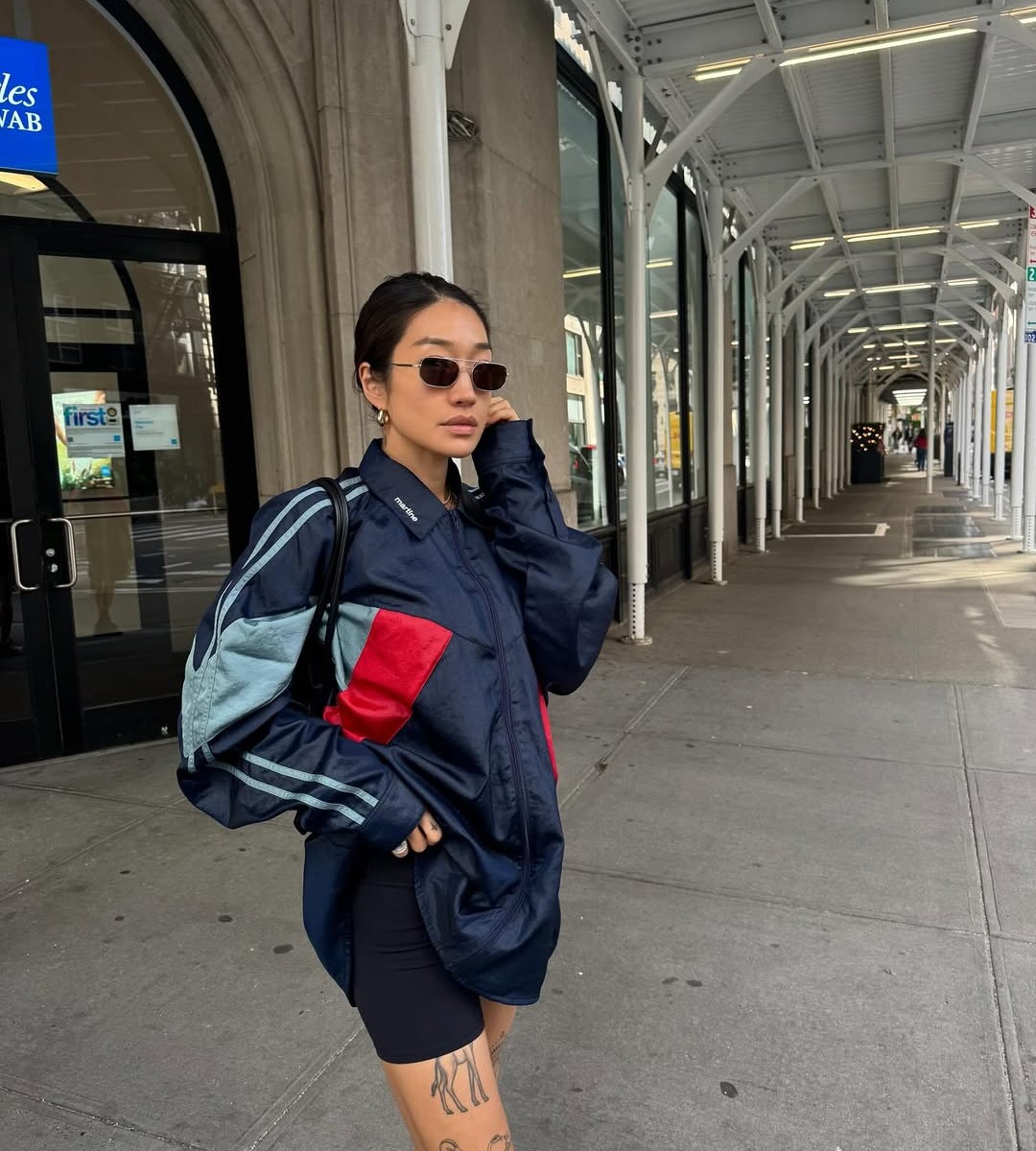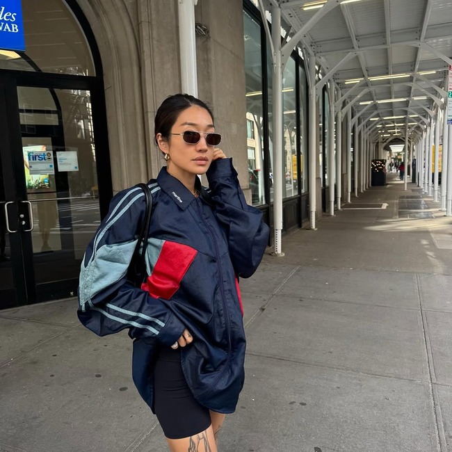 레깅스와 바람막이를 매치해 완성한 에슬레저 무드! 오버사이즈 핏의 네이비 바람막이에 컬러 디테일이 더해져 단순한 운동복으로 보이지 않고 도시적인 쿨함이 느껴져요. 작은 스퀘어 선글라스와 미니멀한 이어링을 더해 90년대 레트로 감성을 자연스럽게 녹여낸 것도 포인트. 아침에는 쌀쌀하고, 낮에는 기온이 오르는 간절기에, 바람막이를 걸치면 스타일은 물론 실용성까지 챙길 수 있습니다.