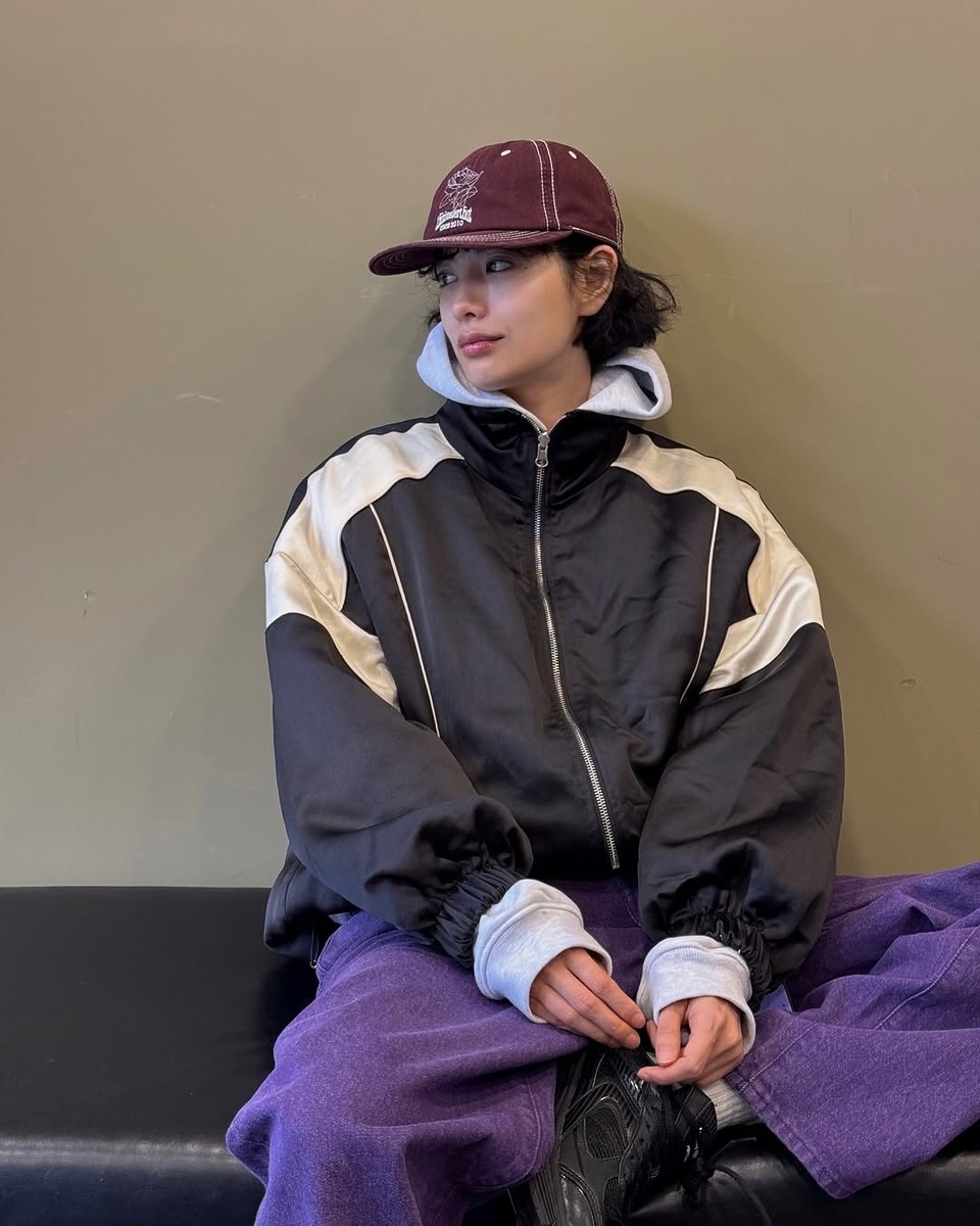 후드 위에 오버핏 바람막이를 걸쳐 연출한 간절기 룩의 정석! 루즈한 실루엣이 편안한 무드를 살려주고 바람막이의 포인트 디자인이 단조롭지 않게 룩의 재미를 더합니다. 여기에 버건디 볼캡과 퍼플 팬츠를 더해 경쾌한 무드까지 살렸어요. 데일리룩으로도 손색없는 레이어드 스타일, 꾸안꾸 스타일링이 필요할 때 나나의 룩을 참고해 보세요.