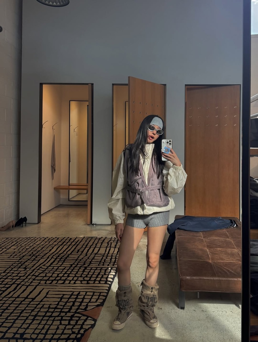 노제는 바람막이 위에 유틸리티 조끼를 더해 이색적인 레이어드 룩을 선보였어요. 바람막이의 가벼운 볼륨감과 조끼의 구조적인 실루엣이 만나 스타일 센스를 한 단계 업그레이드했습니다. 헤어밴드와 선글라스를 활용해 스포티한 무드를 강조하고, 니트 쇼츠와 부츠를 더해 바람막이를 활용한 꾸꾸꾸룩 완성! 개성을 살리면서도 실용적인 스타일링 아이디어가 필요할 때 참고해 보세요.