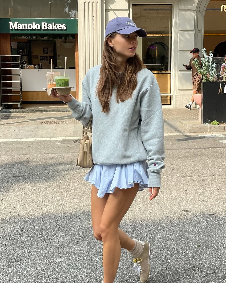 오버사이즈 스웨트 셔츠에 플리츠 스커트, 스니커즈와 볼캡까지 더하면 걸리시 무드가 느껴지는 룩이 완성됩니다. 스커트의 경쾌한 움직임과 스니커즈의 편안함, 볼캡이 주는 캐주얼한 포인트가 조화를 이루며 학생처럼 풋풋하면서도 편안한 분위기를 연출합니다.