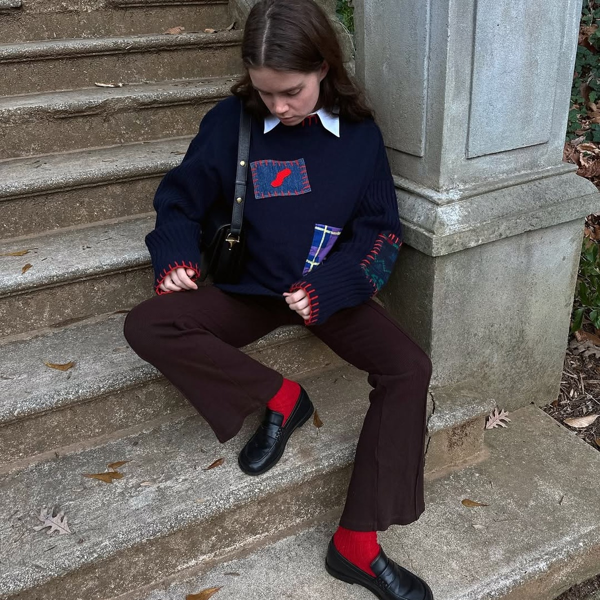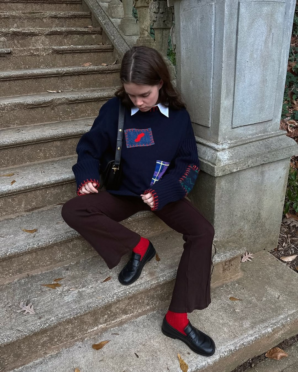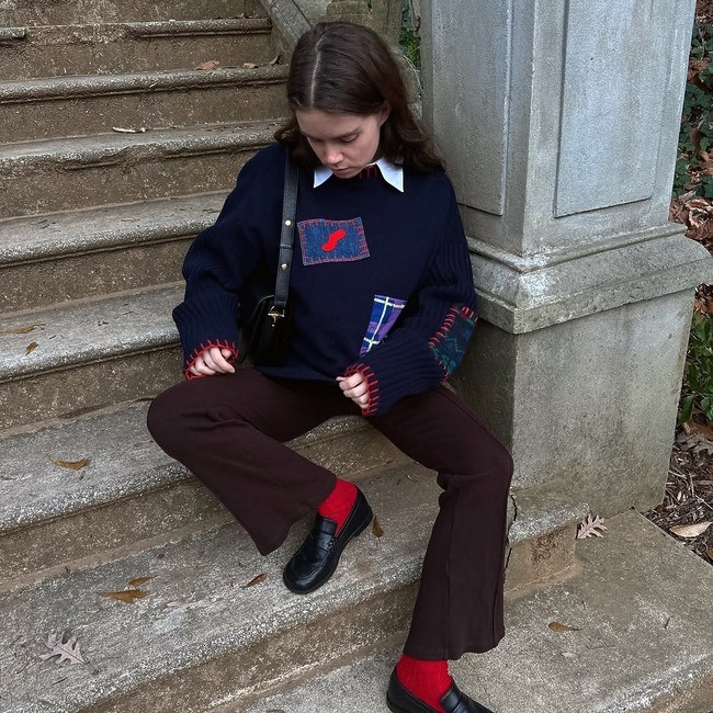 브라운과 레드만큼 찰떡궁합을 자랑하는 컬러가 또 있을까요? 브라운 부츠컷 팬츠에 비비드한 레드 양말을 신어주면 예상치 못한 컬러 포인트가 룩 전체를 생생하게 살려줘요. 브라운의 안정감을 깨뜨리지 않으면서도 레드의 톡톡 튀는 발랄함이 더해져 뻔하지 않은 데일리룩이 완성됩니다.