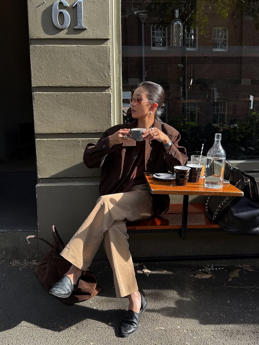 브라운 팬츠의 가장 큰 매력은 블랙이나 데님에서 느낄 수 없는 따뜻하고 고급스러운 무드죠. 브라운을 가장 세련되게 입는 방법은 톤을 맞추는 것. 카멜 컬러 팬츠와 짙은 브라운 점퍼를 매치하면 클래식하면서도 정제된 무드가 완성됩니다. 여기에 액세서리까지 골드 계열로 통일하면 가을 무드를 200% 살릴 수 있죠.
