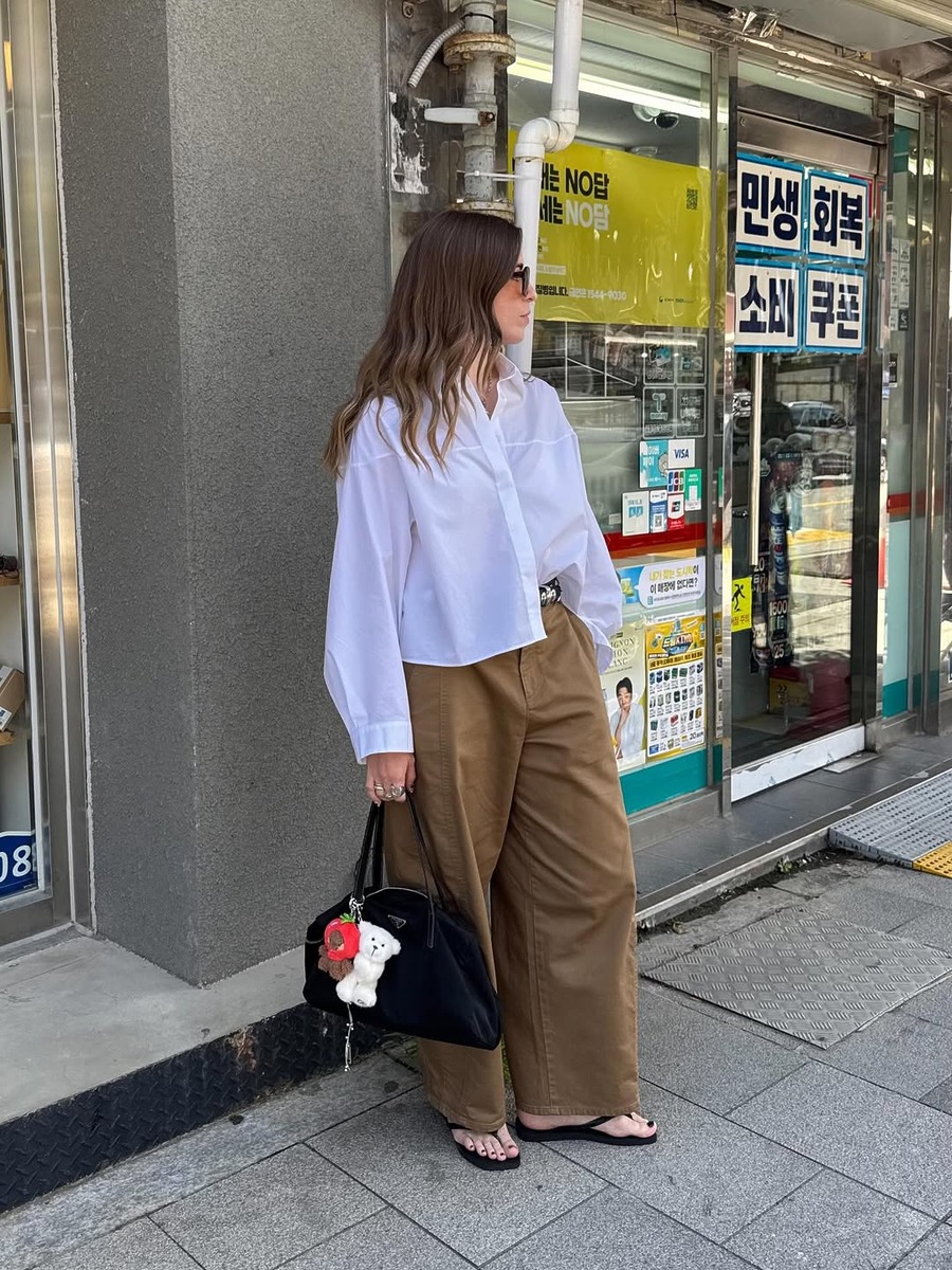 깔끔하면서도 시크하게 보이고 싶을 땐, 브라운 팬츠에 화이트 셔츠를 매치하는 것이 가장 확실하죠. 단정함 속에서 브라운 특유의 따뜻한 기운이 은근하게 느껴져 오피스룩으로도, 데이트룩으로도 실패 없는 조합! 팬츠 실루엣은 넉넉한 핏을 선택해 우아한 무드를 더하는 것을 추천해요.