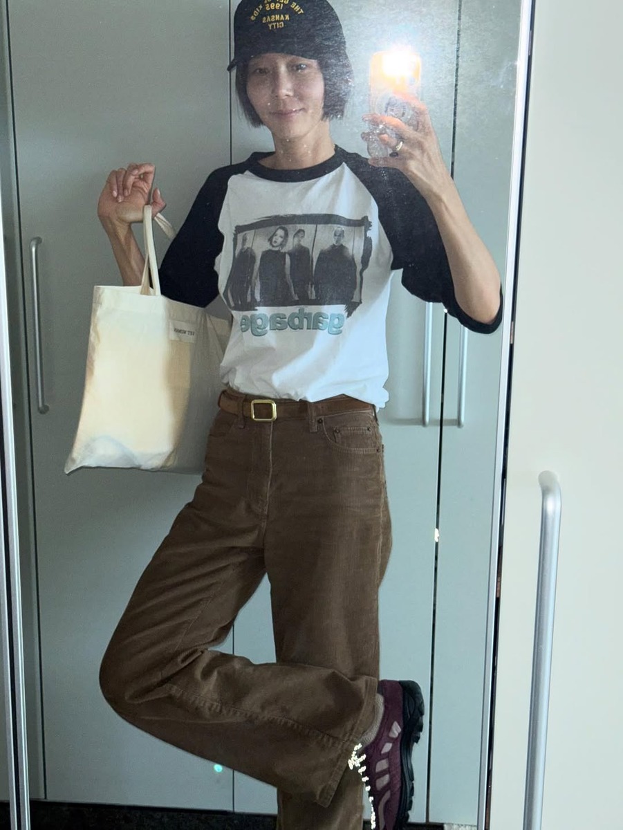 하이웨이스트 브라운 진에 빈티지 링거 티셔츠를 더하면 힘을 뺀 듯 자연스러운 매력이 살아납니다. 기본에 충실한 듯 보이지만 팬츠의 컬러가 바뀌는 순간, 룩의 무드는 180도 달라지죠. 오래 입은 듯한 티셔츠의 질감과 브라운 데님의 톤이 어우러져 빈티지 무드가 한층 살아나요.