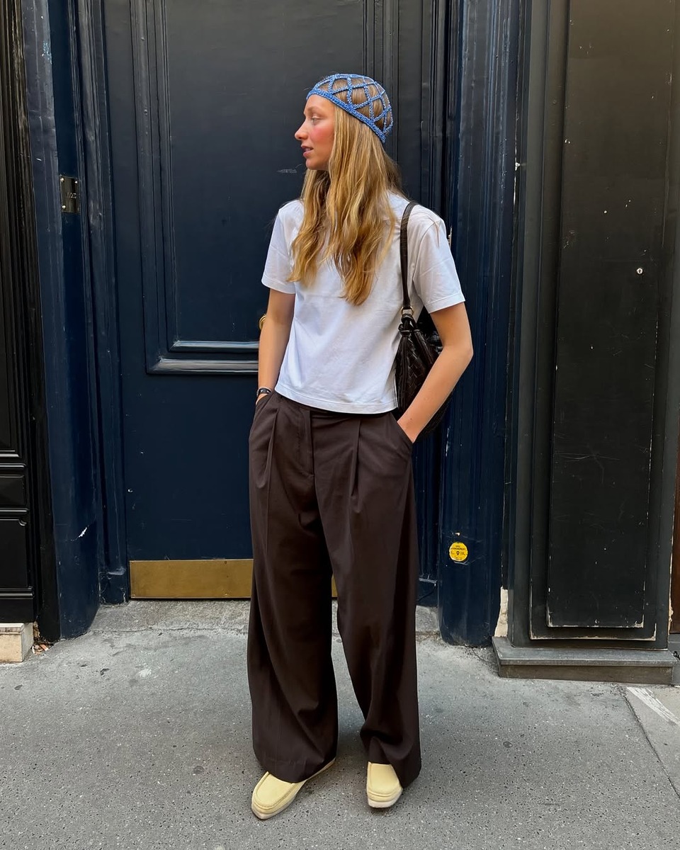 브라운 팬츠는 의외로 밝은 컬러와도 잘 어울린다는 사실! 짙은 브라운 팬츠에 레몬 옐로 슈즈와 하늘색 크로셰 모자를 더하면 자칫 무겁게 느껴질 수 있는 브라운이 한층 경쾌해져요. 짙은 브라운 팬츠가 룩의 중심을 잡아주고 산뜻한 컬러 포인트가 살짝 더해져 완벽한 균형을 이룹니다.