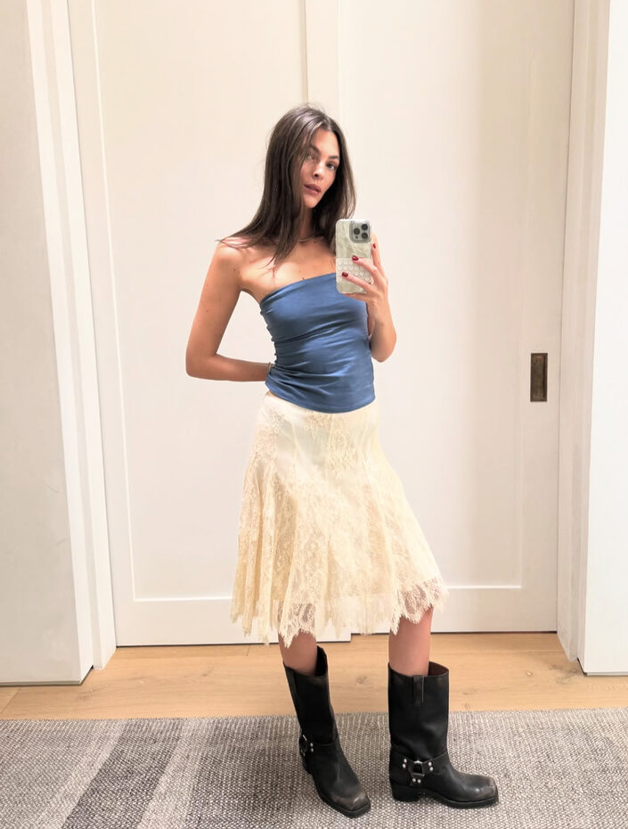라이더 부츠를 선택했다면, 레이스 아이템과 함께 매치해 보세요. 페미닌한 무드의 레이스에 라이더 부츠의 러프함이 더해져 이질적인 듯 조화로운 룩을 완성할 수 있어요.