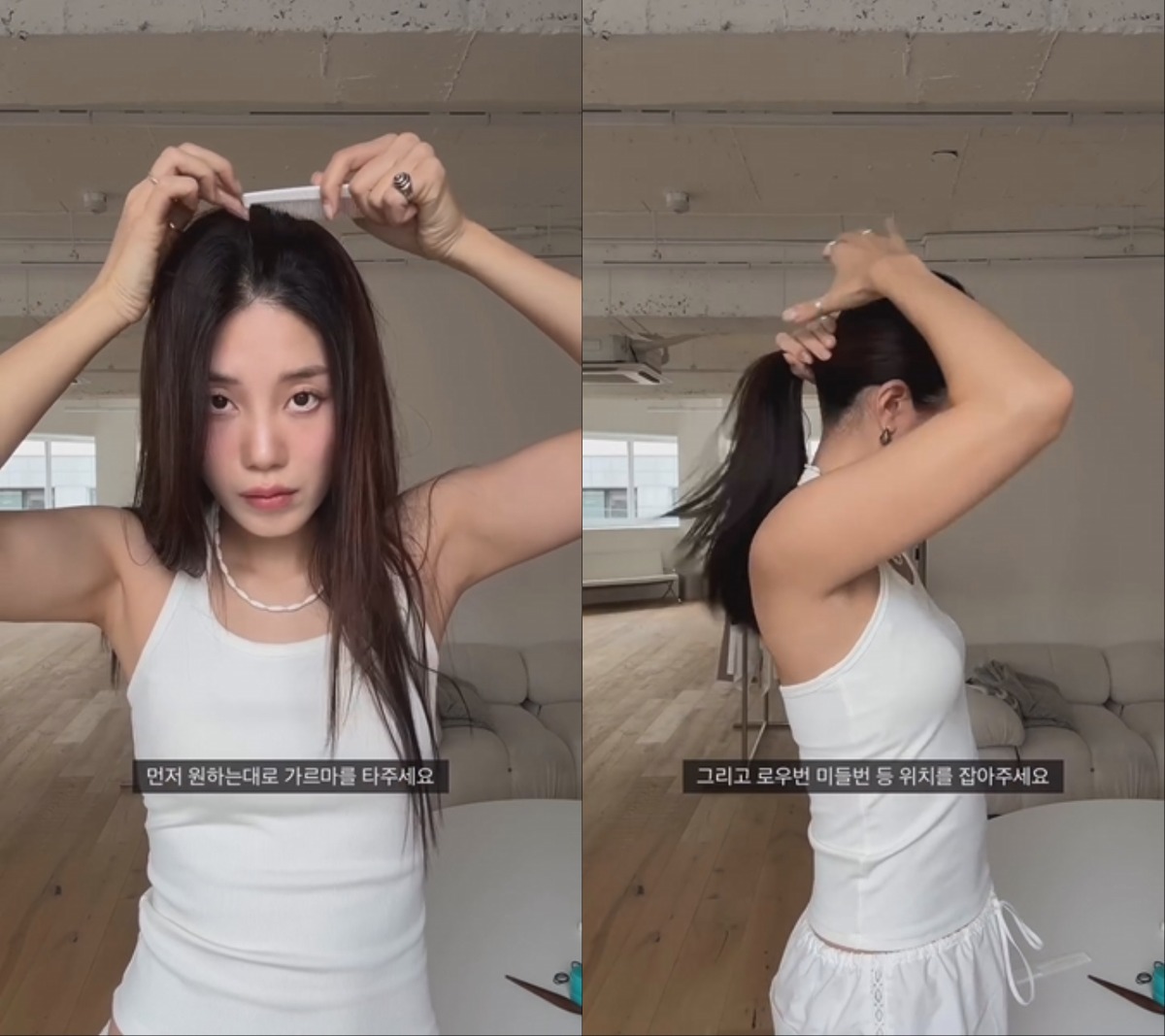 켄달처럼 5:5 또는, 내 얼굴에 잘 맞는 가르마를 타 준 뒤 머리카락 전체를 빗어 올리며 번의 위치를 잡아 줍니다. 하이, 미들, 로우 번 중 본인의 추구미에 맞는 위치로 잡으면 되겠죠? 참고로 얼굴이 긴 편이라면 시선을 위로 끌어 올릴 수 있는 하이번이, 얼굴이 동그랗다면 로우 번이 단점을 커버하는 데 좋습니다.