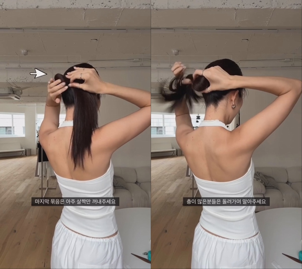 번을 만들 위치를 잡았으면 얇은 고무줄을 이용해 머리를 묶어 주세요. 레이어드 컷이 유행하면서 머리 전체에 층이 진 사람이 많을텐데요, 그런 이들은 인플루언서 희정의 팁을 참고하면 좋습니다. 고무줄을 마지막으로 돌릴 때 머리 전체를 빼지 말고 위의 사진처럼 살짝만 나오게 꺼내 주세요. 그리고 남은 머리를 돌려가면서 말아 준 뒤 또다른 고무줄로 단단히 고정시켜 주면 예쁘게 번이 완성됩니다.