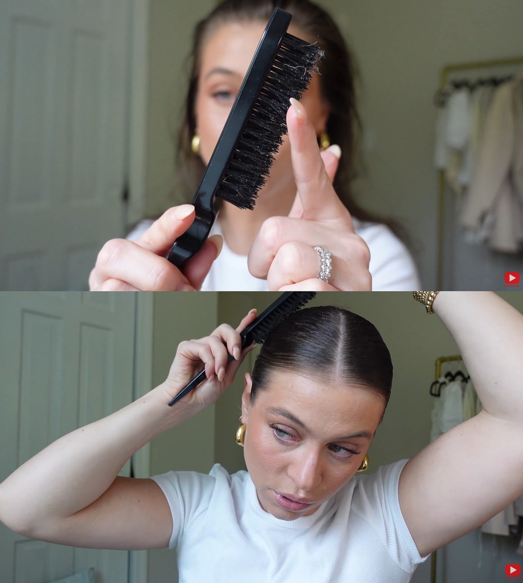 ‘슬릭 번’ 인만큼 깔끔하게 빗어 넘긴 머리가 생명이죠. 머리를 다시 한 번 손질해 주는데요, 이때 일반 꼬리빗이 아니라 이미지 속에서 사라가 들고 있는 것처럼 생긴, 업스타일용 돈모 브러시를 이용해 다시 한 번 머리를 매끈하게 만들어 줍니다.