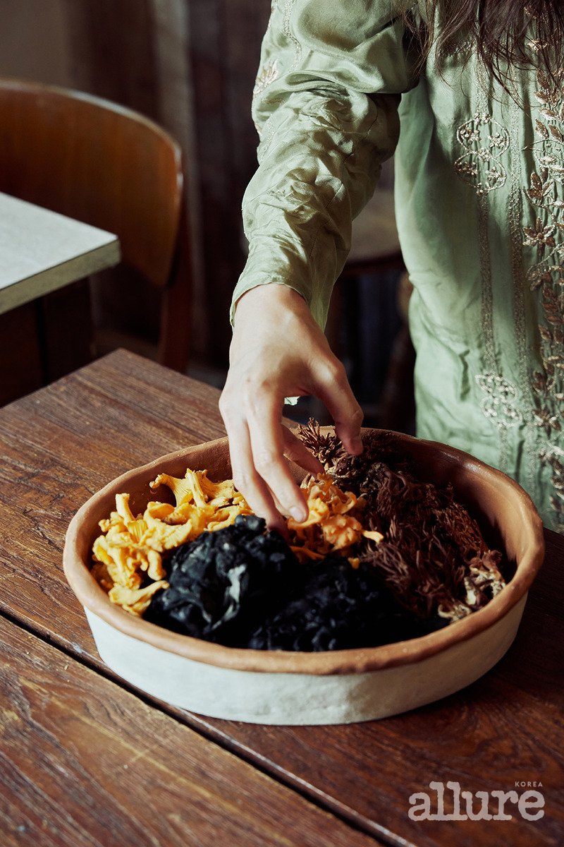 ‘#이윤경요리’라는 해시태그로 SNS에 올리곤 헀던 레시피와 에세이를 모은 <이윤경 요리>를 펴낸 후 1주일에 사흘만 문을 여는 마나를 찾는 사람이 더 많아졌다. “요리를 정식으로 배운 건 아니었지만, 돌이켜보면 어린 시절에 책을 읽을 때도 낯선 음식을 항상 상상했어요. 스무 살에 독립했을 때도 놀러 온 친구들에게 음식을 만들어주는 게 재미있었어요. 그런 기억이 지금의 저로 이끈 것 같아요. 오랫동안 있는 메뉴도, 계절에 나오는 메뉴도 돌이켜보면 조금씩 유년 시절의 추억이 담겨 있어요.” 질감이 돋보이는 커다란 도자기 그릇에는 다양한 야생 버섯이 수북하다. 꾀꼬리버섯, 먹버섯, 참싸리버섯 등 시중에서는 쉽게 볼 수 없는 재료다.