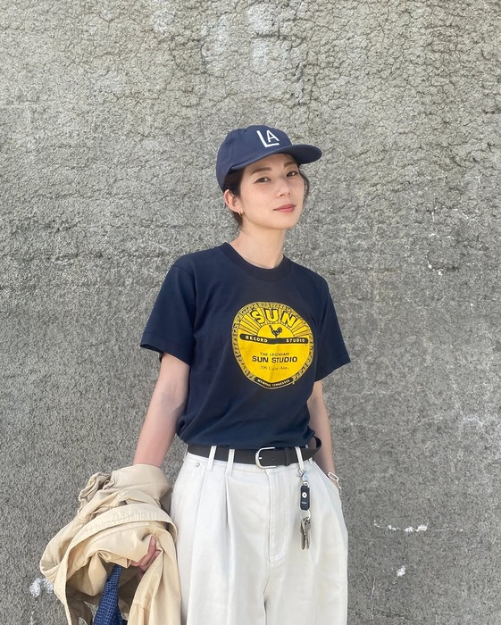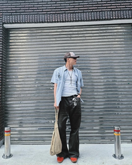 커다란 인형 키링이 부담스럽다면 조금 더 실용적이고 얌전한 옵션도 있습니다. 작은 키링을 벨트 고리에 걸어 보는 거죠. 워크팬츠에 티셔츠 그리고 허리에 달린 키링까지. 빈티지 스케이터 무드가 자연스럽게 완성됩니다.