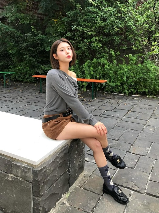 오프숄더 니트도 얼마든지 단정하게 연출할 수 있다는 사실! 그레이 니트에 브라운 미니스커트를 매치하면 차분하면서도 세련된 데일리룩이 완성되죠. 여기에 플랫슈즈로 안정감을 주고, 체크나 아가일 삭스로 디테일을 더하면 아기자기한 매력이 살아납니다.