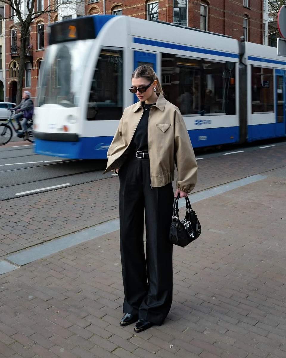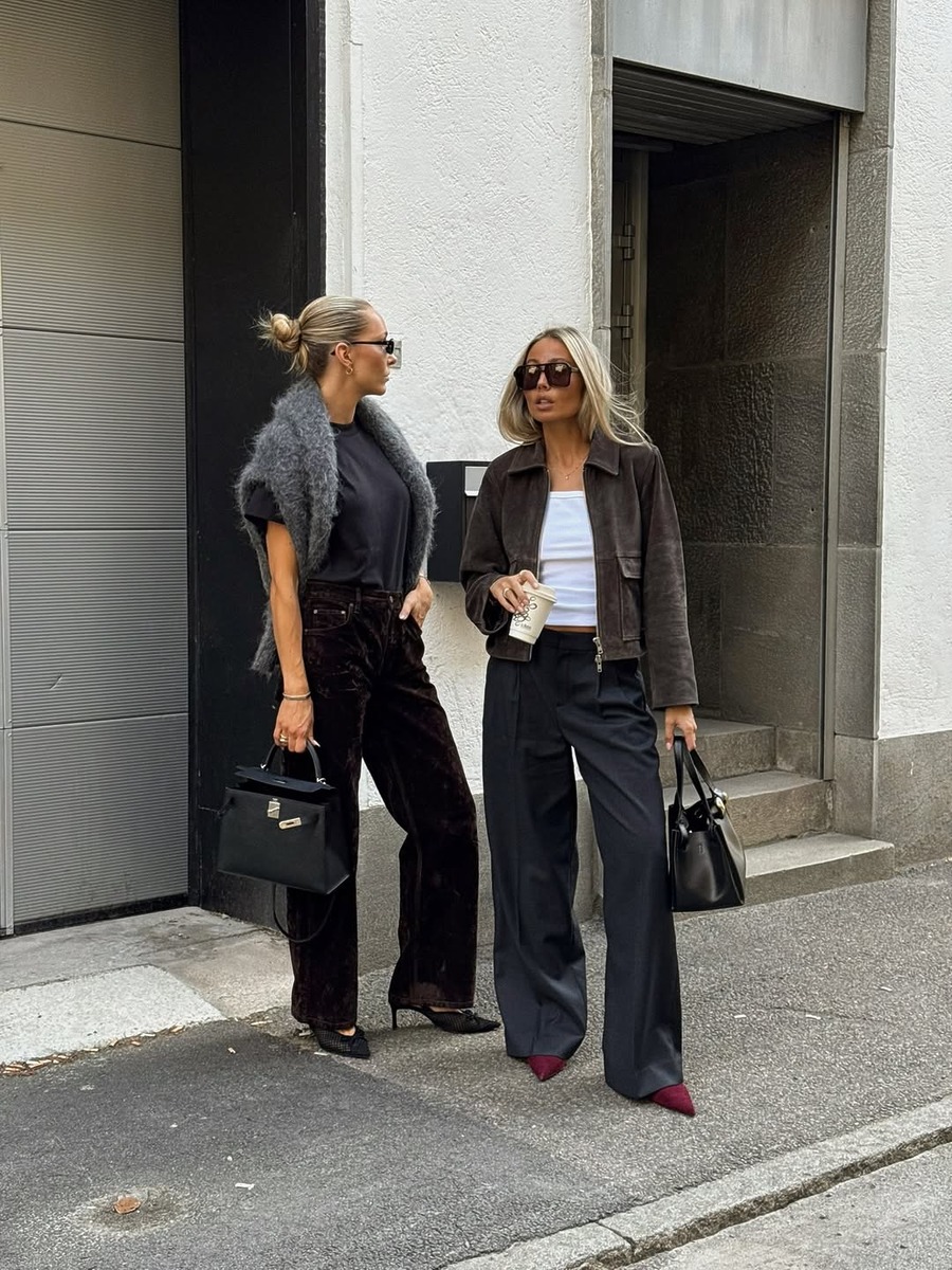적당한 너비의 와이드 팬츠는 직장인이라면 없어서는 안될 아이템이에요. 데님 팬츠도 마찬가지죠. 통이 적당한 와이드 팬츠에 재킷을 걸치는 이 단순한 조합만으로 프로페셔널한 느낌을 줄 수 있어요. 여기에 앞 코가 뾰족한 구두를 신어 바지 밑단으로 살짝 살짝 보이게 연출하면 성숙하고 여성스러운 느낌까지 더할 수 있죠. 포멀한 느낌의 팬츠라면 이번 시즌 메가 트렌드로 자리잡은 스웨이드 재킷과 함께 매치해보세요. 이 세련된 조합은 올가을 가장 손이 자주 가는 조합이 될 거에요.
