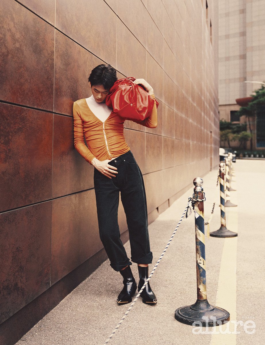프로테아 열대 꽃 모양에 모티프를 둔 ‘프로테아’ 숄더백과 포인티드 토 첼시부츠는 베르사체. 비스코스 소재 하이넥 니트 톱과 후크 디테일의 카디건은 셀프포트레이트(Self-Portrait). 코듀로이 진은 셀린느(Celine).