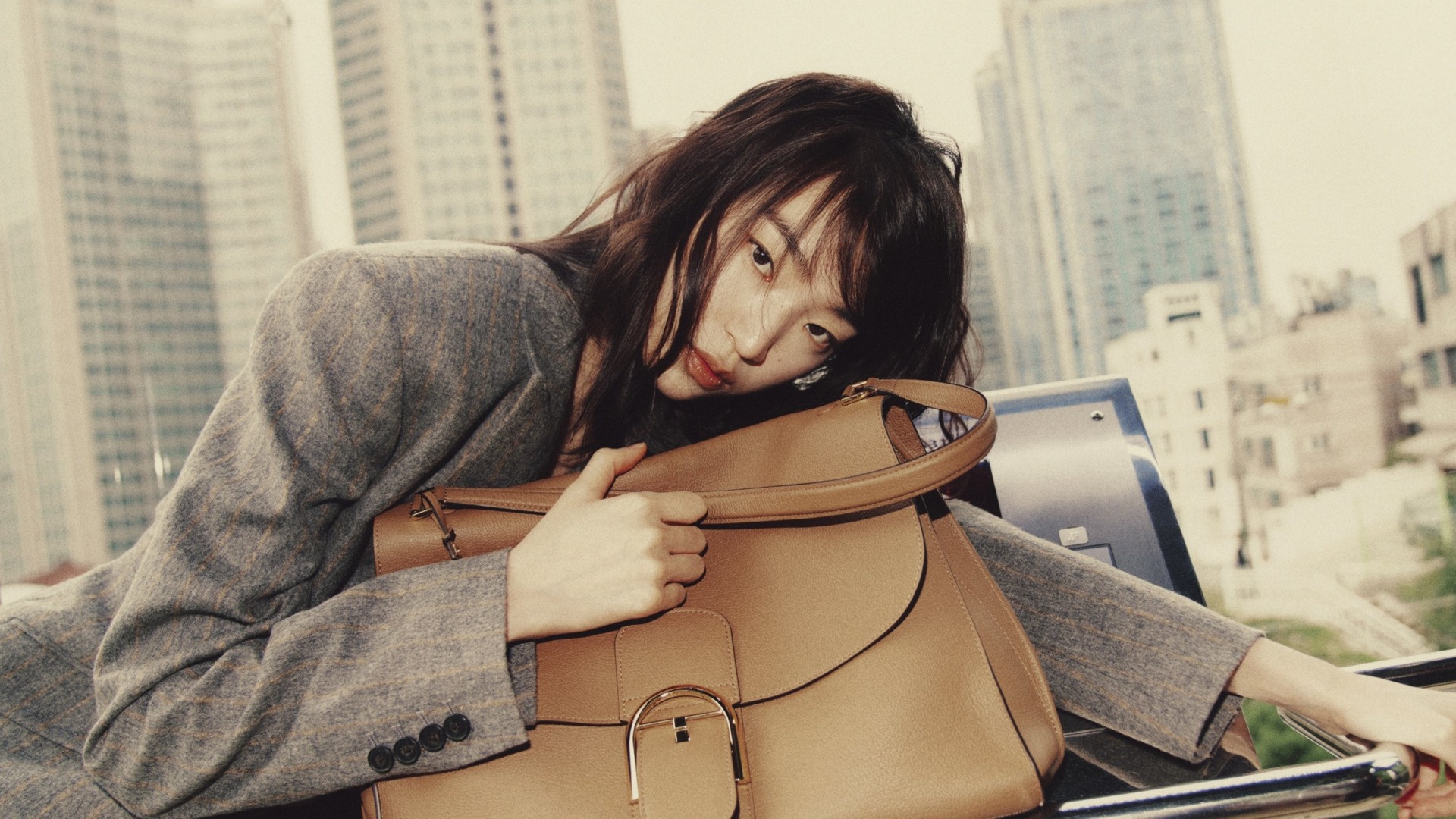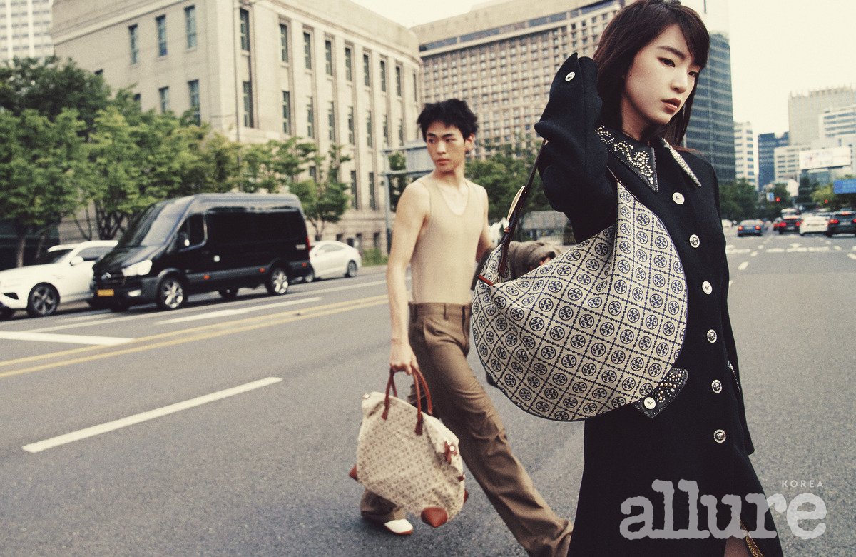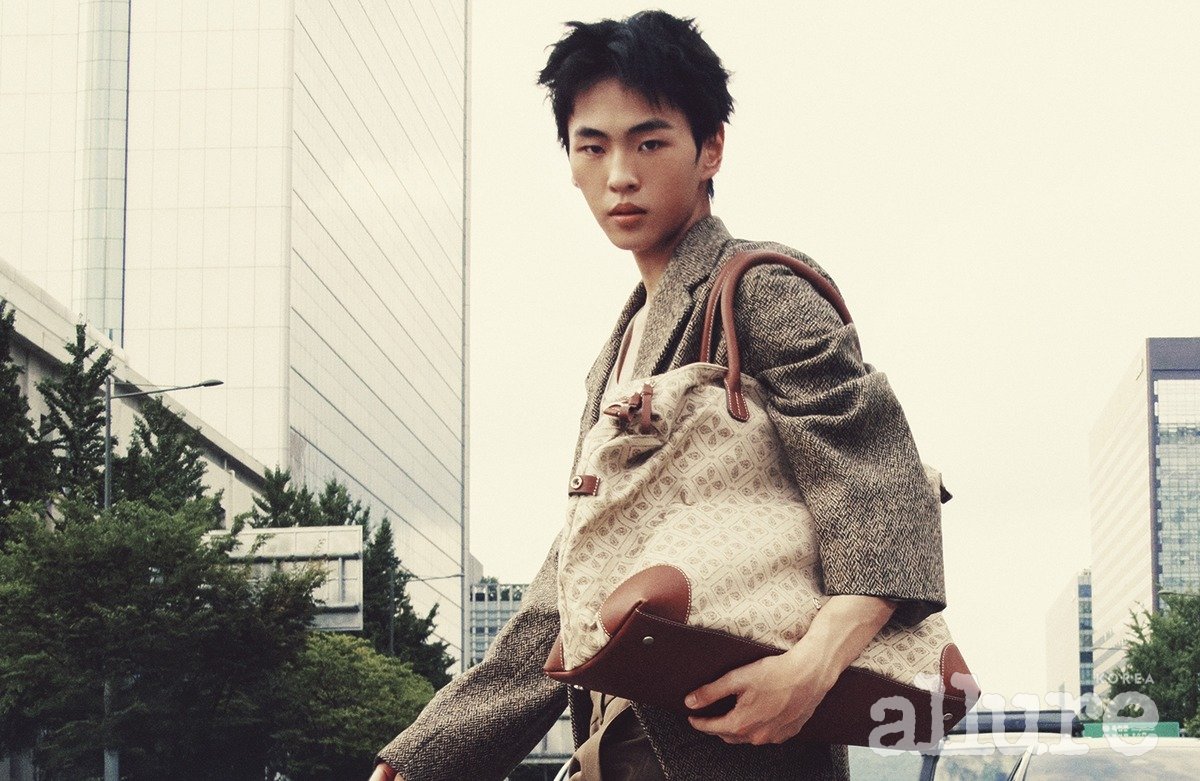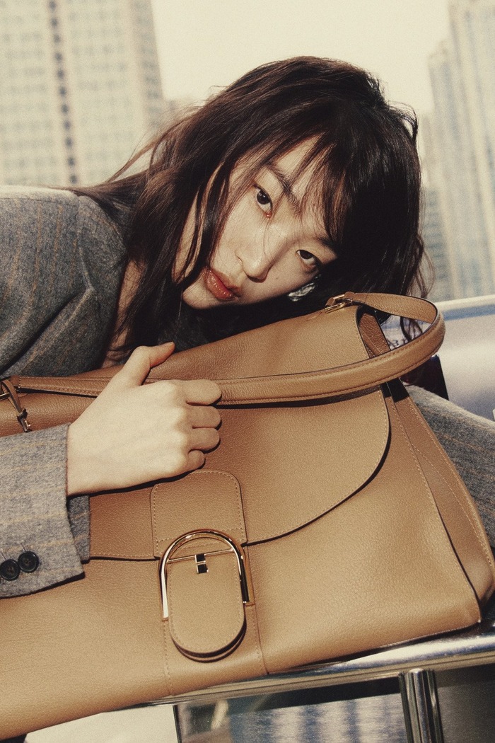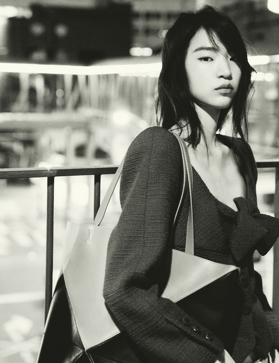 채운이 든 자카드 소재 ‘리버 자카드 오버나이터’ 백은 헬렌카민스키(Helen Kaminski). 트위드 헤링본 코트, 울 소재 슬리브리스 톱과 스트레이트 팬츠, 나파 가죽 소재의 슬립온 슈즈는 모두 르메르(Lemaire).