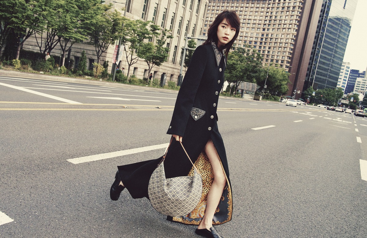 제이가 든 입체적인 형태의 ‘티모노그램 벌룬’ 백은 토리버치(Tory Burch). 치타 프린트 안감이 매력적인 맥시 울 코트는 베르사체(Versace). 타비 슈즈는 메종 마르지엘라.