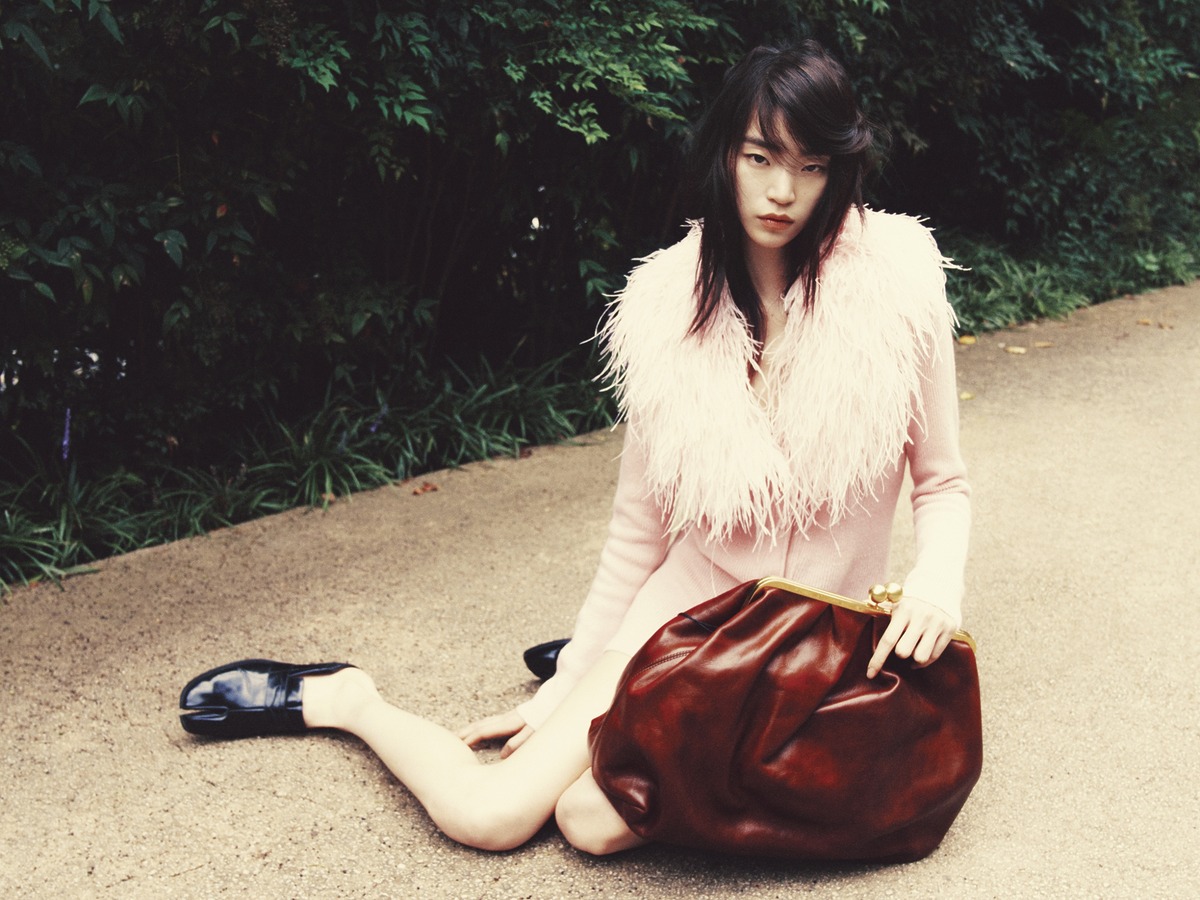 메탈 구 형태의 잠금장치가 달린 ‘미르테’ 백은 위크엔드 막스마라(Weekend Maxmara). 퍼 칼라 장식의 롱 카디건은 블루마린(Blumarine). 타비 슈즈는 메종 마르지엘라.