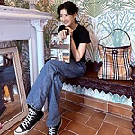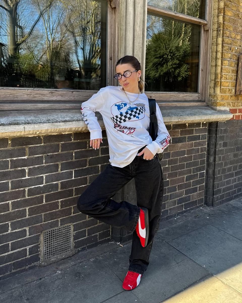 심플한 블랙 진엔 컬러 포인트가 필요합니다. 블랙 진에 레드 스니커즈를 더하면 룩 전체가 살아나죠. 상의는 화이트로 정리해 슈즈 하나만 돋보이게 하는 것이 핵심! 과하지 않으면서도 강렬한 포인트를 줄 수 있습니다.