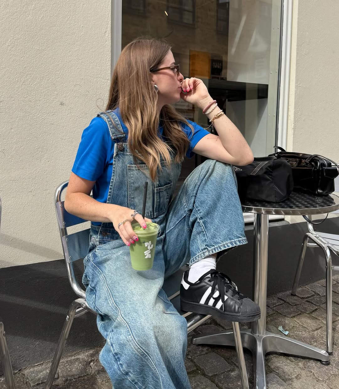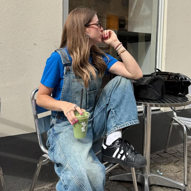 데님 오버올은 자칫 촌스러워 보일 수 있지만, 블랙 스니커즈로 균형을 잡으면 문제 없어요. 블루 톤 오버올과 티셔츠 조합에 블랙 슈즈가 전체 톤을 정리해 캐주얼하면서도 깔끔한 무드를 만들어줍니다.
