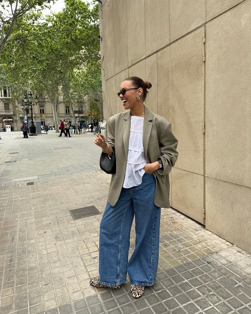 뻔한 조합을 탈피하고 싶다면 패턴 스니커즈를 선택해 보세요. 블레이저와 와이드 데님 팬츠에 레오퍼드 스니커즈를 매치하면 시크하면서도 위트 있는 출근룩이 완성되죠. 패턴 하나로 룩 전체의 분위기가 전환되는 효과를 경험할 수 있을 거예요.