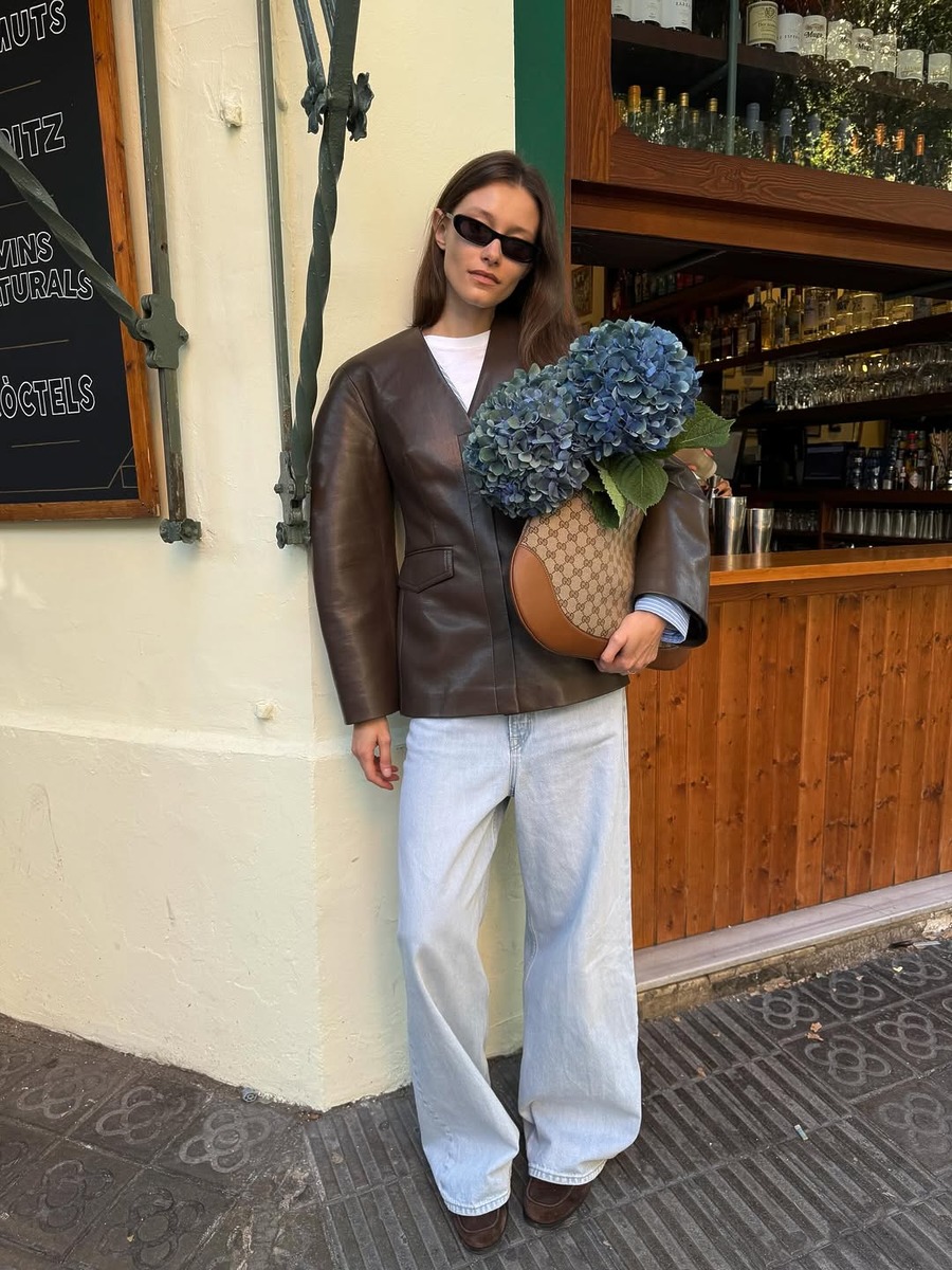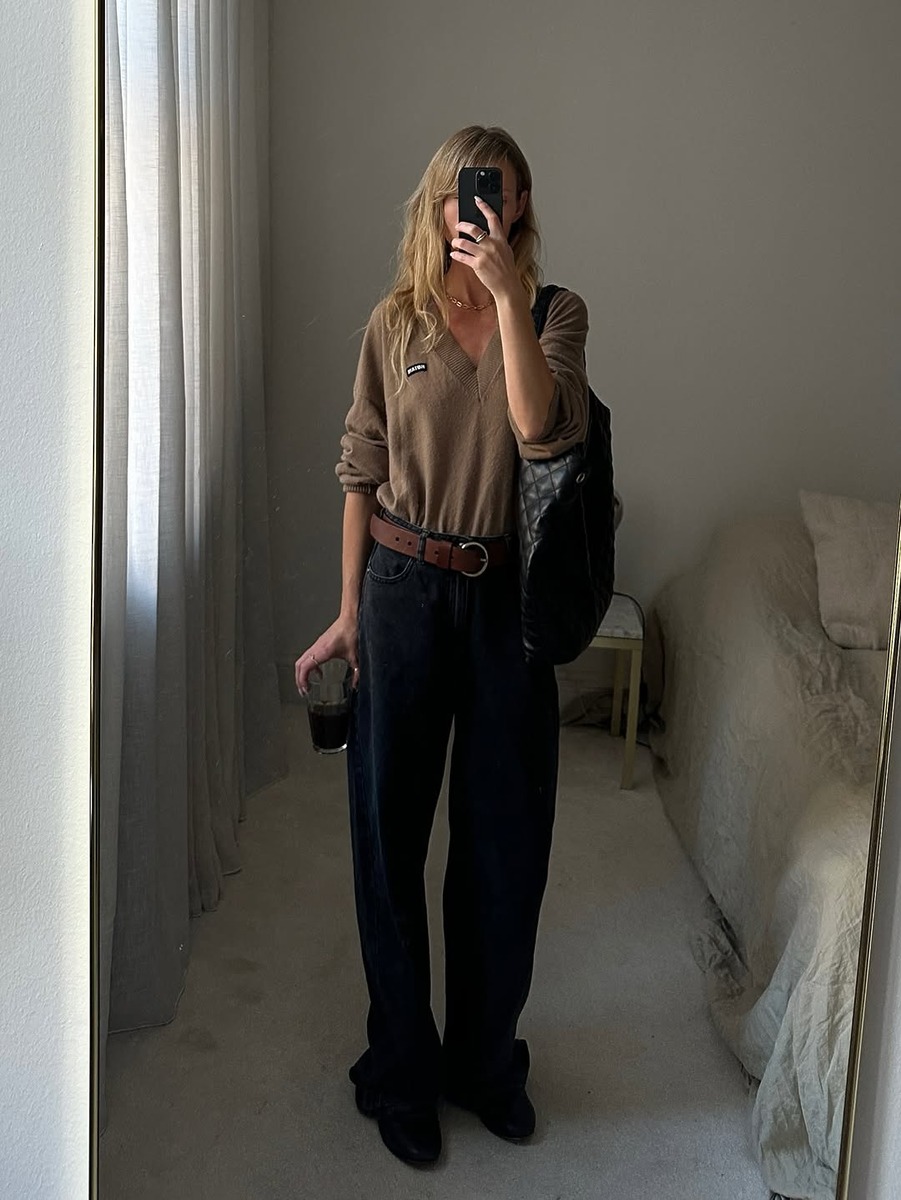 브라운은 포멀뿐 아니라 캐주얼에도 의외로 잘 어울린다는 사실! 얇은 브라운 브이넥 니트에 블랙 진을 매치하고, 브라운 벨트로 마무리하면 편안하면서도 세련된 데일리룩이 완성됩니다. 이렇듯, 단순한 조합이지만 컬러를 다르게 가져가는 것만으로도 충분히 트렌디해 보일 수 있죠.