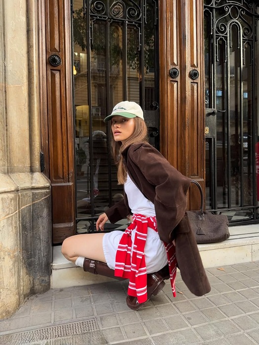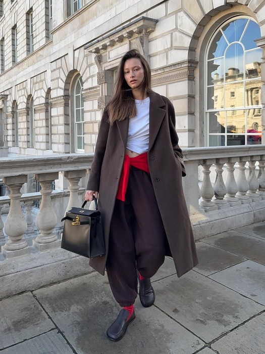 브라운 스타일링이 답답해 보일까 걱정된다면 레드 컬러를 활용해보세요. 딥한 브라운에 강렬한 레드를 더하면 한층 세련된 대비가 만들어지고, 룩에 위트까지 담을 수 있어요. 가방이나 카디건처럼 부피가 작은 아이템에 레드를 배치하면 과하지 않은 포인트를 더할 수 있죠.