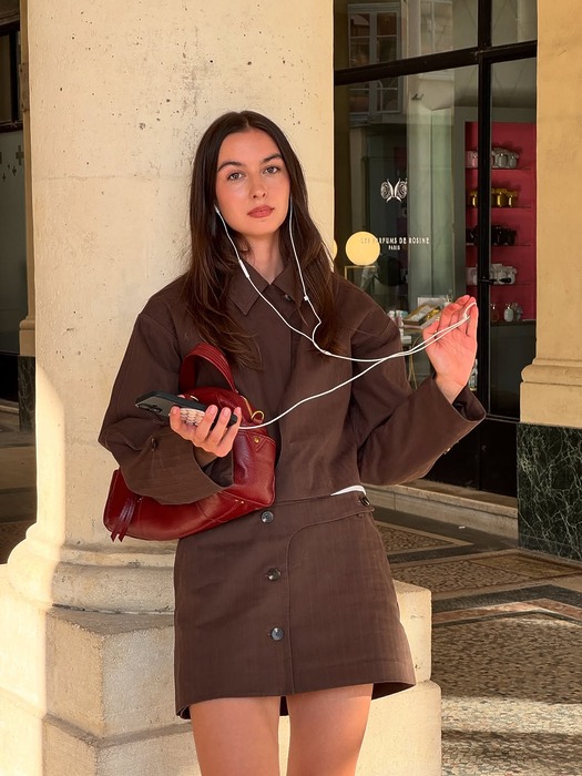 가을 데이트 룩으로는 브라운 미니스커트 셋업에 무릎 위까지 올라오는 부츠를 더해보세요. 브라운의 클래식함과 미니스커트의 걸리시한 분위가 만나 사랑스러운 스타일링이 연출됩니다. 여기에 버건디 백까지 더해주면 깊이감이 생기면서, 풍성한 가을 컬러의 매력을 만끽할 수 있어요.