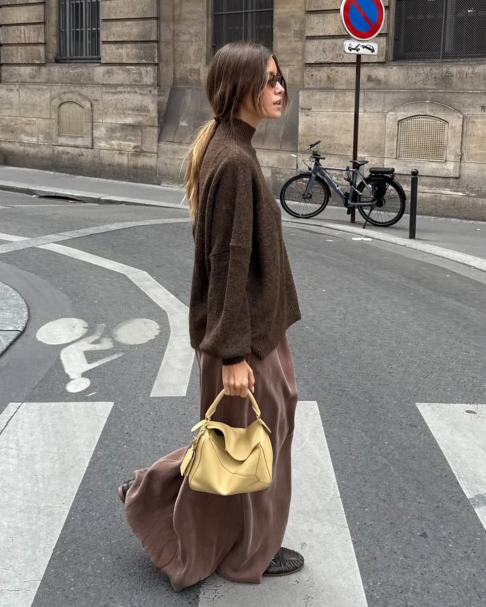 브라운의 매력을 십분 즐기고 싶다면, 브라운 아이템만으로 톤온톤 룩을 연출하는 것도 좋은 방법입니다. 여기에 버터 옐로 백을 매치하면 브라운이 가진 고급스러움은 그대로 살리면서 옐로가 밝은 리듬감을 더해 룩 전체가 경쾌하게 살아납니다.