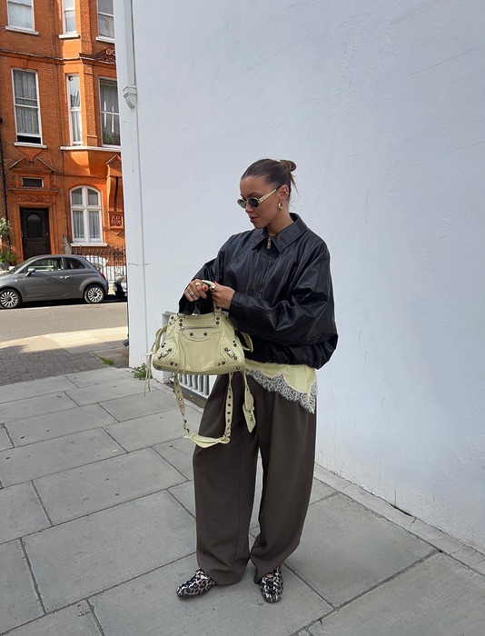 패션 고수들이라면 레더 재킷을 올리브 컬러의 바지와 매치하기도 합니다. 가을 냄새가 물씬 느껴지는 늦가을부터 초겨울에는 울이 함유된 올리브 슬랙스를 입어보세요. 또한 올가을은 빈티지 백의 활약이 어느 때보다 돋보이는 시즌인데요. 패션 피플들이 사랑하는 빈티지 빅 백으로 레더 코디를 완성해 보는 건 어떨까요?