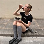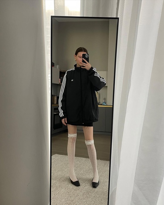 레이스 스커트와 트랙 재킷, 그리고 나일론 니삭스의 조합은 얼핏 상충하는 듯 보이지만, 그 이질감이 오히려 새로운 조화를 만듭니다. 캐주얼한 트랙 재킷에 레이스 스커트와 관능적인 나일론 니삭스가 더해져 균형 있는 스타일링이 완성됩니다.