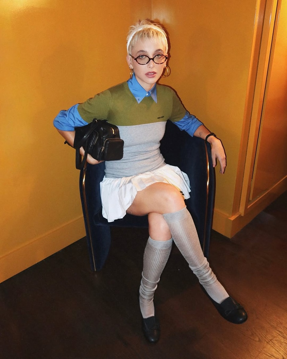 니삭스의 소재에 따라 룩의 분위기도 달라집니다. 엠마 체임벌린은 러블리한 셔츠와 스커트에 은은한 광택감이 있는 그레이 니삭스를 더했어요. 니삭스를 끝까지 올리지 않고 중간에 살짝 내려 신어 실루엣에 변주를 준 센스 덕분에, 사랑스러움 속에 위트가 더해졌습니다.