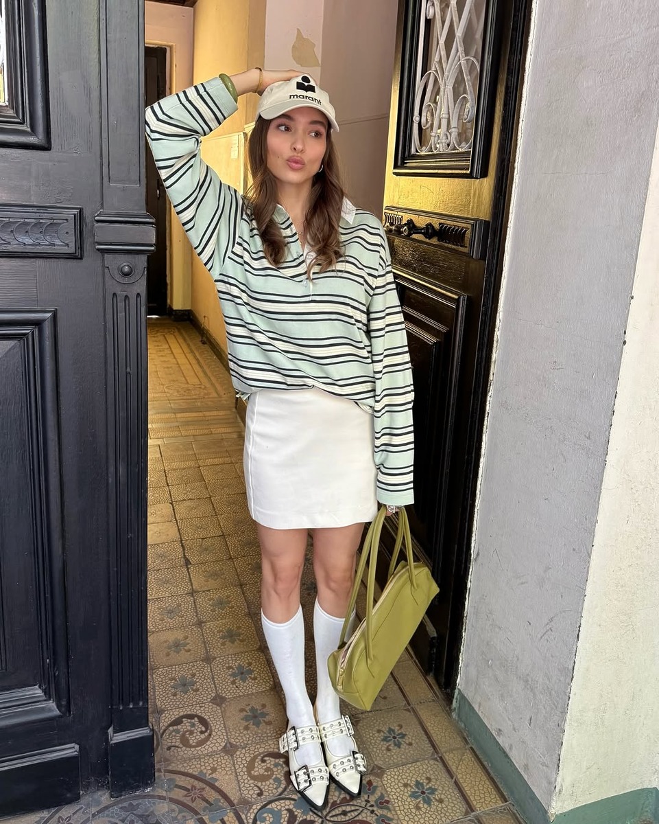 스트라이프 럭비 셔츠와 미니 스커트에 화이트 니삭스와 플랫 슈즈를 더하면 캐주얼하면서도 사랑스러운 무드가 완성됩니다. 키가 작은 편이라면 니삭스와 슈즈의 컬러를 맞춰 다리가 길어 보이는 효과까지 챙겨 보세요.