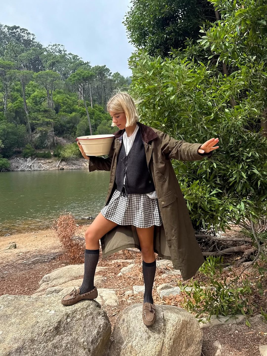 체크 스커트와 헌팅 코트, 테슬 로퍼라는 클래식한 조합에 그레이 니삭스를 더하면 단숨에 걸리시한 분위기가 살아납니다. 니삭스가 스커트의 짧은 길이를 보완하면서도 쌀쌀한 날씨에 보온성까지 챙겨주니 더할나위 없죠.
