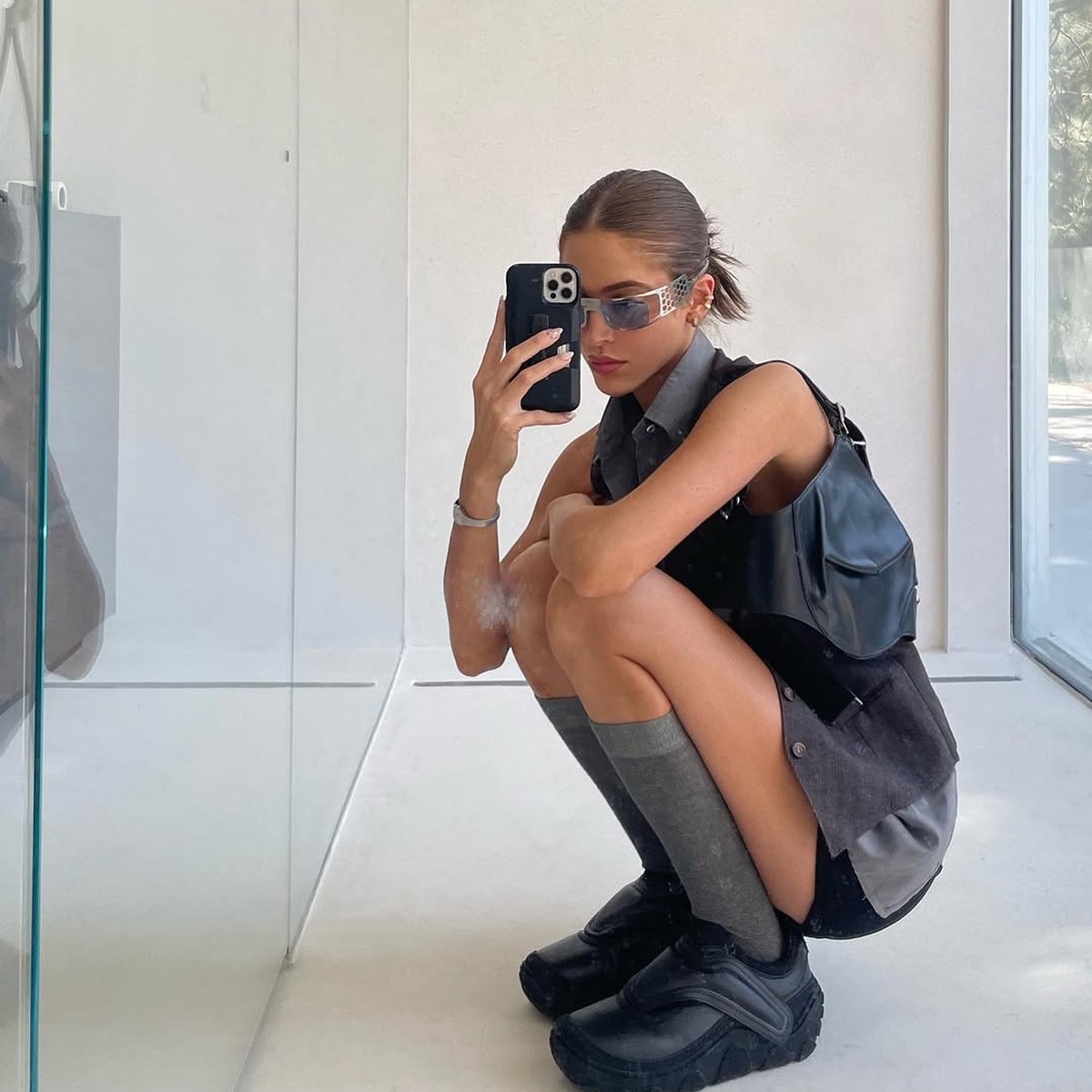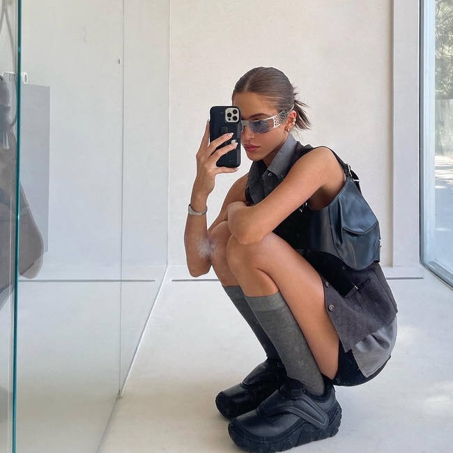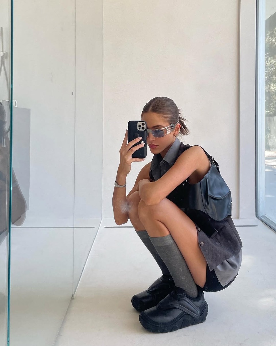 여름 내내 즐겨 입던 마이크로 쇼츠를 가을까지 입고 싶을 때, 답답한 부츠 대신 니삭스를 활용하세요. 니삭스가 짧은 기장의 부담은 줄이고 쿨한 무드를 더해줍니다. 청키한 스니커즈와 고글을 함께 매치하면 스트리트 감성이 느껴지는 트렌디한 룩을 연출할 수 있죠.
