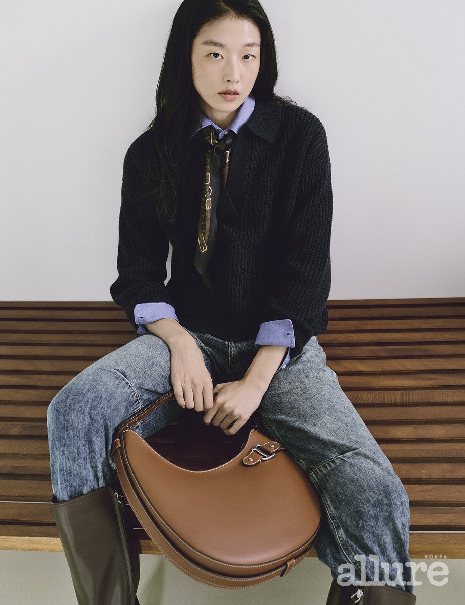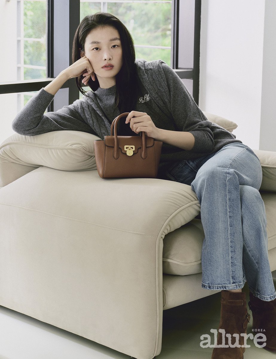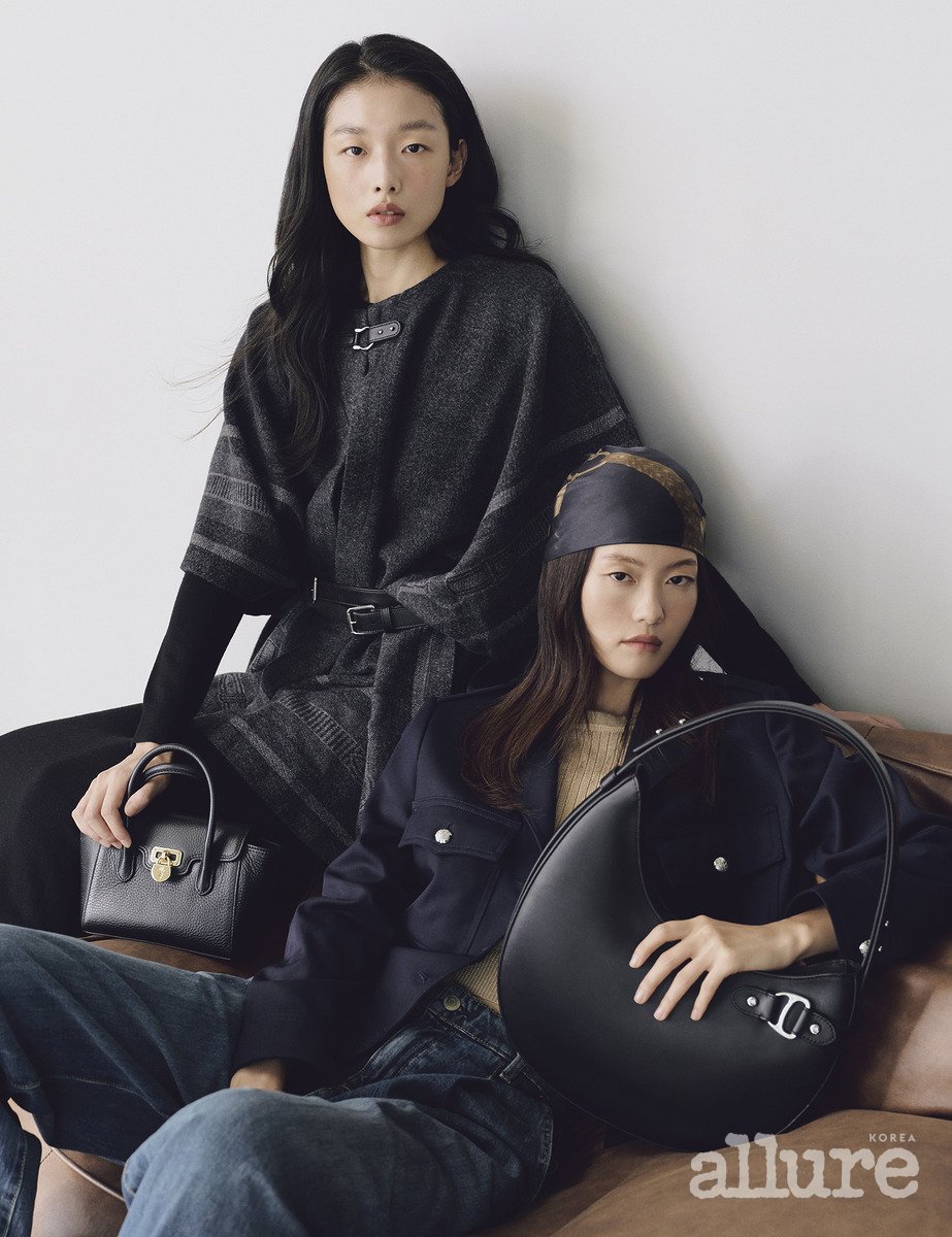 아라가 입은 울 크루넥 스웨터 드레스와 버클 트림 벨트 모티프 자카드 루아나, 레더 더블 버클 벨트와 페블 레더 스몰 태너 사첼은 모두 로렌 랄프 로렌. 지원이 입은 크롭트 울 블렌드 트윌 재킷, 리브 리넨 블렌드 쇼트 슬리브 스웨터, 하이라이즈 플리츠 와이드 레그 진, 헤어에 활용한 벨트 프린트 실크 스퀘어 스카프와 레더 라지 타샤 숄더백은 모두 로렌 랄프 로렌.