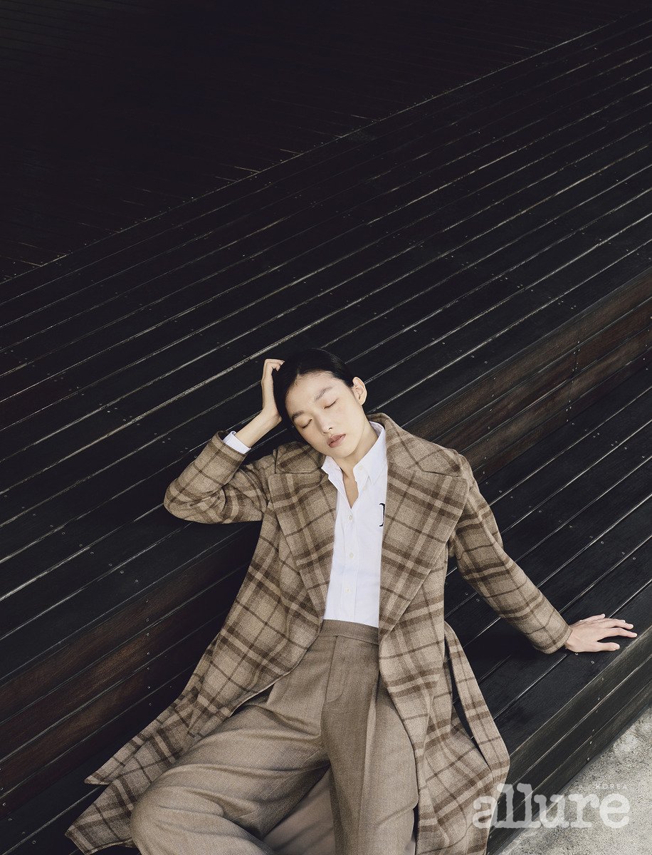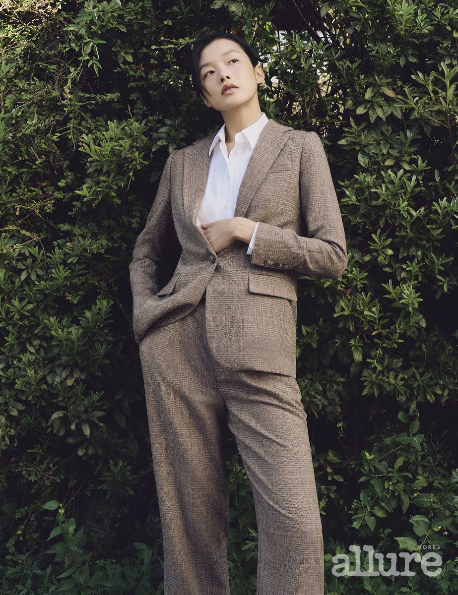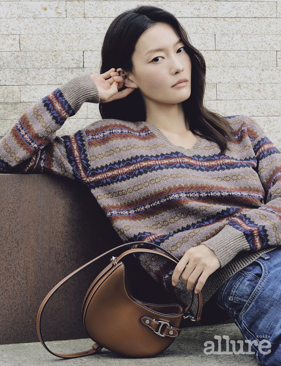 아라가 입은 울 크루넥 스웨터 드레스와 버클 트림 벨트 모티프 자카드 루아나, 레더 더블 버클 벨트와 페블 레더 스몰 태너 사첼은 모두 로렌 랄프 로렌. 지원이 입은 크롭트 울 블렌드 트윌 재킷, 리브 리넨 블렌드 쇼트 슬리브 스웨터, 하이라이즈 플리츠 와이드 레그 진, 헤어에 활용한 벨트 프린트 실크 스퀘어 스카프와 레더 라지 타샤 숄더백은 모두 로렌 랄프 로렌.