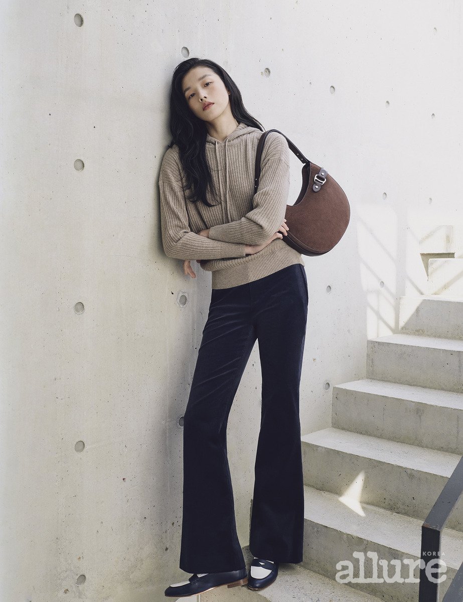 리브 니트 캐시미어 스웨터 후디와 하이라이즈 코듀로이 플레어 팬츠, 스웨이드 라지 타샤 숄더백은 모두 로렌 랄프 로렌.