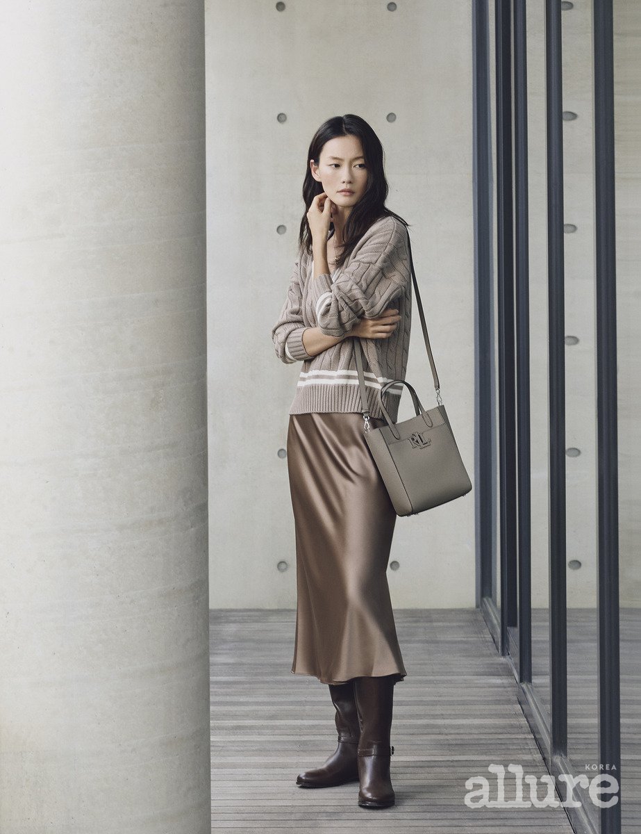 케이블 니트 코튼 크리켓 스웨터, 새틴 샤르무즈 미디스커트, 페블 레더 스몰 캐머린 토트백과 브룩 II 카프스킨 톨 부츠는 모두 로렌 랄프 로렌.
