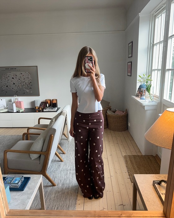 때로는 폴카 도트도 이처럼 우아하고 얌전하게 소화할 수 있습니다. 몸에 착 달라붙는 롱스커트 위에 길게 내려오는 니트를 매치하면 가녀리고 슬림해 보이는 룩을 완성할 수 있죠. 여기에 굽이 높지 않은 키튼힐을 신어 걸음걸이마저 산뜻하게 만들어줄 수 있고요. 바지 역시 마찬가지예요. 발등까지 덮는 길이의 폴카 도트 팬츠는 누구나 모델 핏 비율을 연출할 수 있는 히든 아이템이죠.