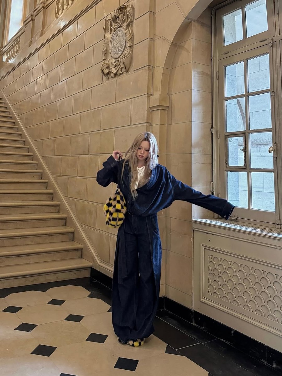 성공적으로 패션 위크 데뷔를 마친 올데이 프로젝트. 그 중에서도 베일리의 쿨한 스타일이 화제였어요. 베르사체, 꾸레주, 뮈글러 등 여러 쇼에 참석한 베일리는 쇼마다 색다른 매력을 뽐냈답니다. 뮈글러의 쇼를 찾는 날은 각진 어깨, 케이프 스타일의 소매, 실키한 소재감이 매력적인 옐로 드레스로 성숙하고 우아한 분위기를 연출했어요. 로에베는 한층 캐주얼한 룩을 선보였어요. 데님 소재의 루스한 재킷과 팬츠에 체커 보드 패턴의 퍼 슈즈와 가방으로 포인트를 줬죠!