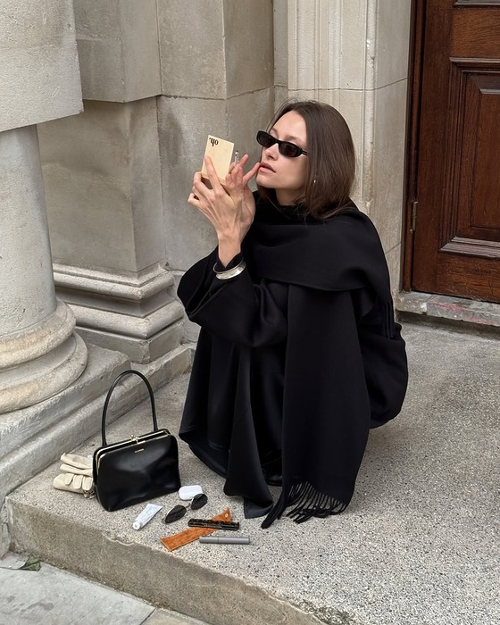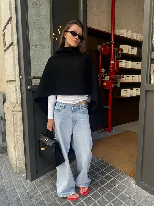스키니 진이 돌아왔음에도 케이프 코트를 쿨하게 입는 방법은 로우 진에 무심하게 툭 걸치는 것임을 알게 해주는 룩. 짧은 케이프 코트라면 모델처럼 플립플롭에 매치해도 전혀 지장이 없죠. 캐주얼한 자리가 아니라면 오른쪽처럼 올블랙으로 입으세요. 아우터, 바지, 가방, 신발, 선글라스까지 블랙으로 맞추니 고급스러운 분위기까지 살아나죠.