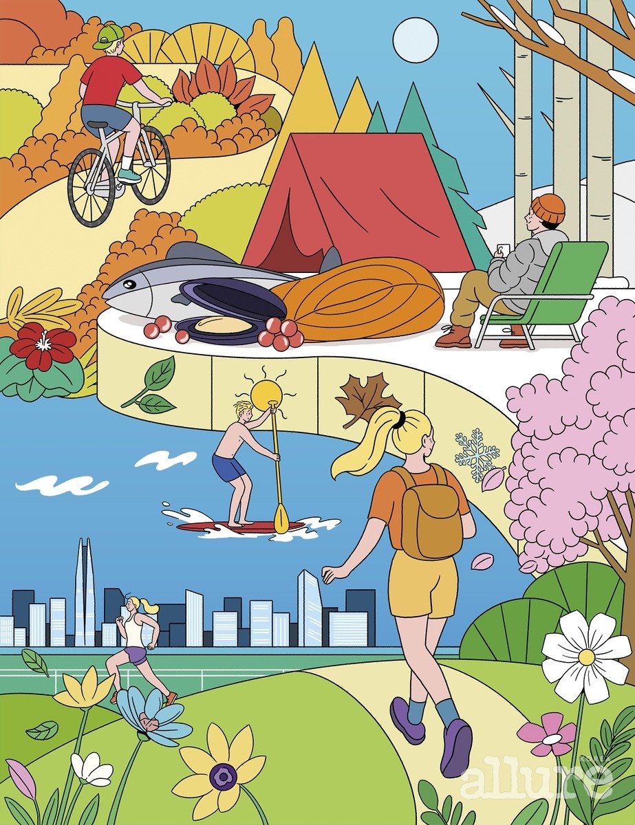 계절을 즐기는 데는 호캉스나 해외여행, PT, 미용 시술처럼 비용이 많이 들지 않는다. 집 앞 공원 벤치에서 1시간 정도 하릴없이 앉아 있는 것만으로도 제철을 만끽할 수 있으니, 오히려 이 계절에 집중하는 게 바쁜 일상에서 벗어나는 방법이 될 수 있다는 거다. 제철 식재료 즐기기, 철마다 바뀌는 자연 즐기기, 지속 가능성 고민하기 등 제철을 즐기는 대표적인 방법은 웰니스 트렌드와도 연결된다. 다시 말해 몇 년 전부터 이어져온 헬시 플레저(Healthy Pleasure) 트렌드의 연장선이라고 할 수 있다.