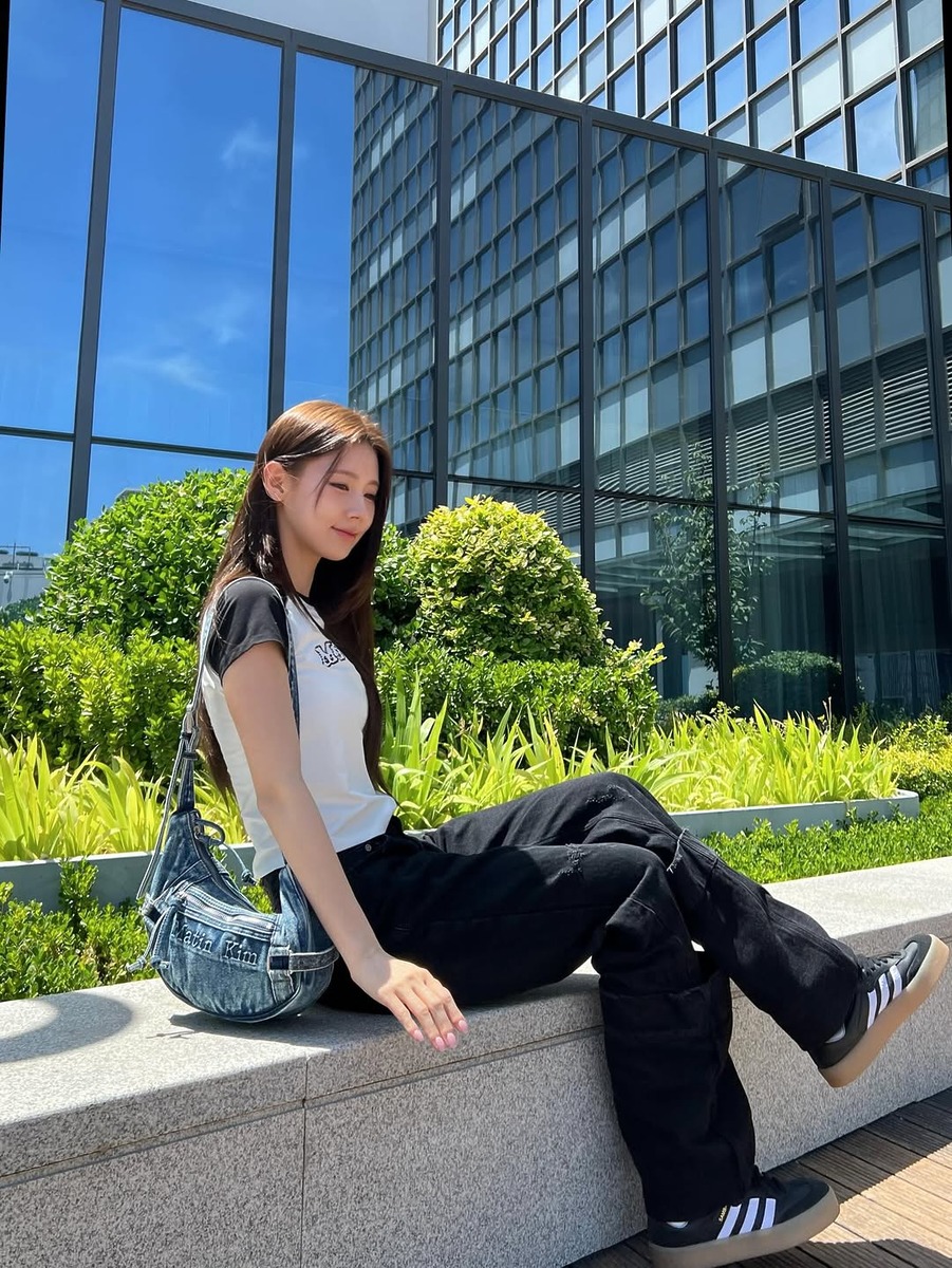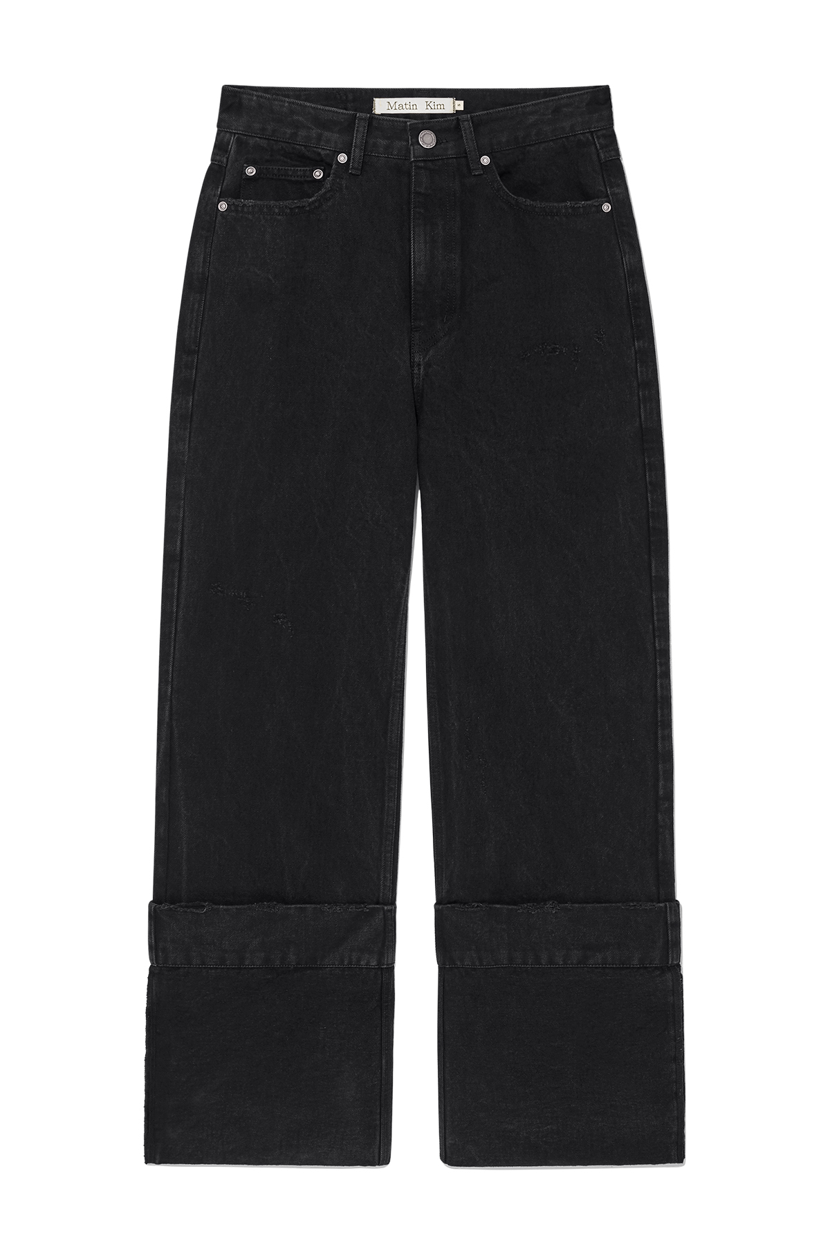 블루 계열 데님들을 많이 봤으니 이번엔 블랙 아이템을 한 번 볼까요? 아이들 미연이 입은 바지는 자세히 보면 마치 크게 롤업을 한 것 같은, 밑단처럼 보이는 디테일이 들어가 있습니다. 이 위트 있는 바지는 마뗑 킴 제품으로 독특하지만 과하지 않아 은근한 관종 성향인 내향인들에게도 좋습니다. 베이직한 데님을 많이 보유하고 있다면 한 번은 이런 디자인에 도전해 보세요!