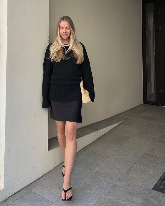 때로는 그레이, 블랙처럼 모노톤의 니트 웨어를 입을 때 역시 같은 톤의 스커트와 매치하면 그 우아함이 한껏 올라갑니다. 오픈 토 슈즈를 신으면 섹시함이 더해지고 스틸레토 힐은 언제나 클래식한 룩을 완성시키죠. 이때 중요한 건 바로 액세서리. 컬러풀한 백을 당당하게 들기 좋은 룩입니다. 강렬한 주얼리도 자유롭게 추가해 보세요.