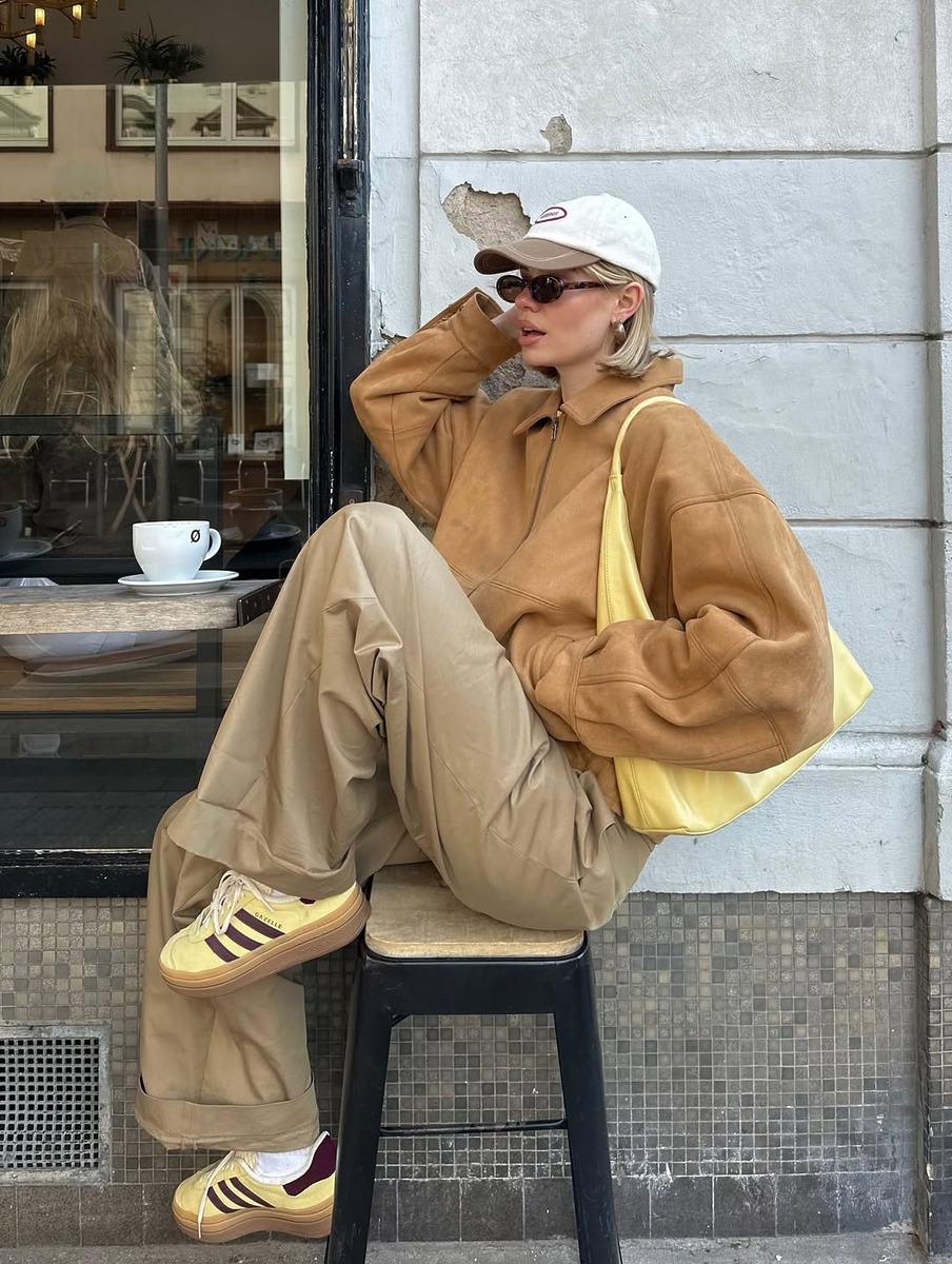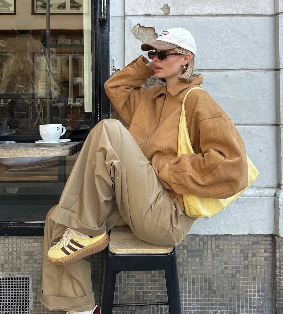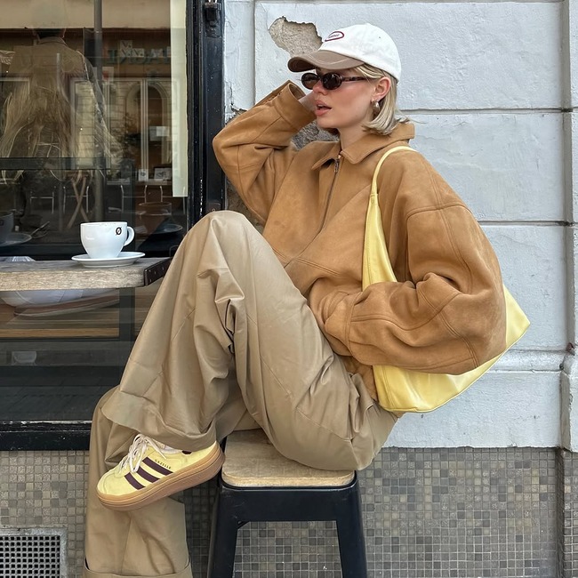가을이면 자주 찾게 되는 스웨이드 블루종에 톤온톤으로 볼캡을 매치해보면 어떨까요? 여유로운 실루엣과 부드러운 색감이 어우러져 따뜻하면서도 감각적인 무드를 완성해줍니다. 여기에 포인트로 옐로 백과 스니커즈를 더하면? 전체 룩에 산뜻한 에너지가 더해지죠.